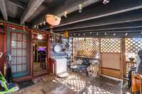 The main level features 2 bedrooms, a full bath, kitchen, and living room with access to a cozy covered patio. Upstairs, the former apartment includes a bedroom with balcony, living area, kitchen space, and half bath — with plumbing already in place for a full kitchen and bath. The covered breezeway leads to a bonus room + large utility room ( also plumbed for a full bath) , providing even more flexibility.