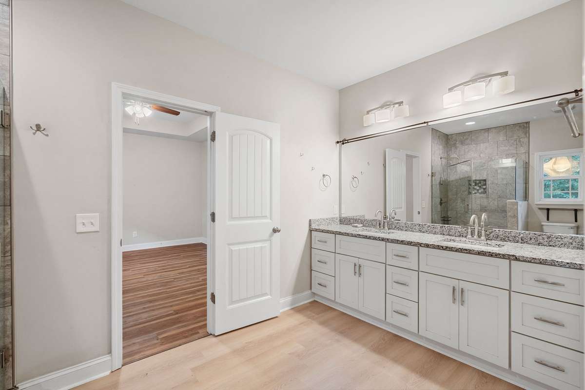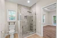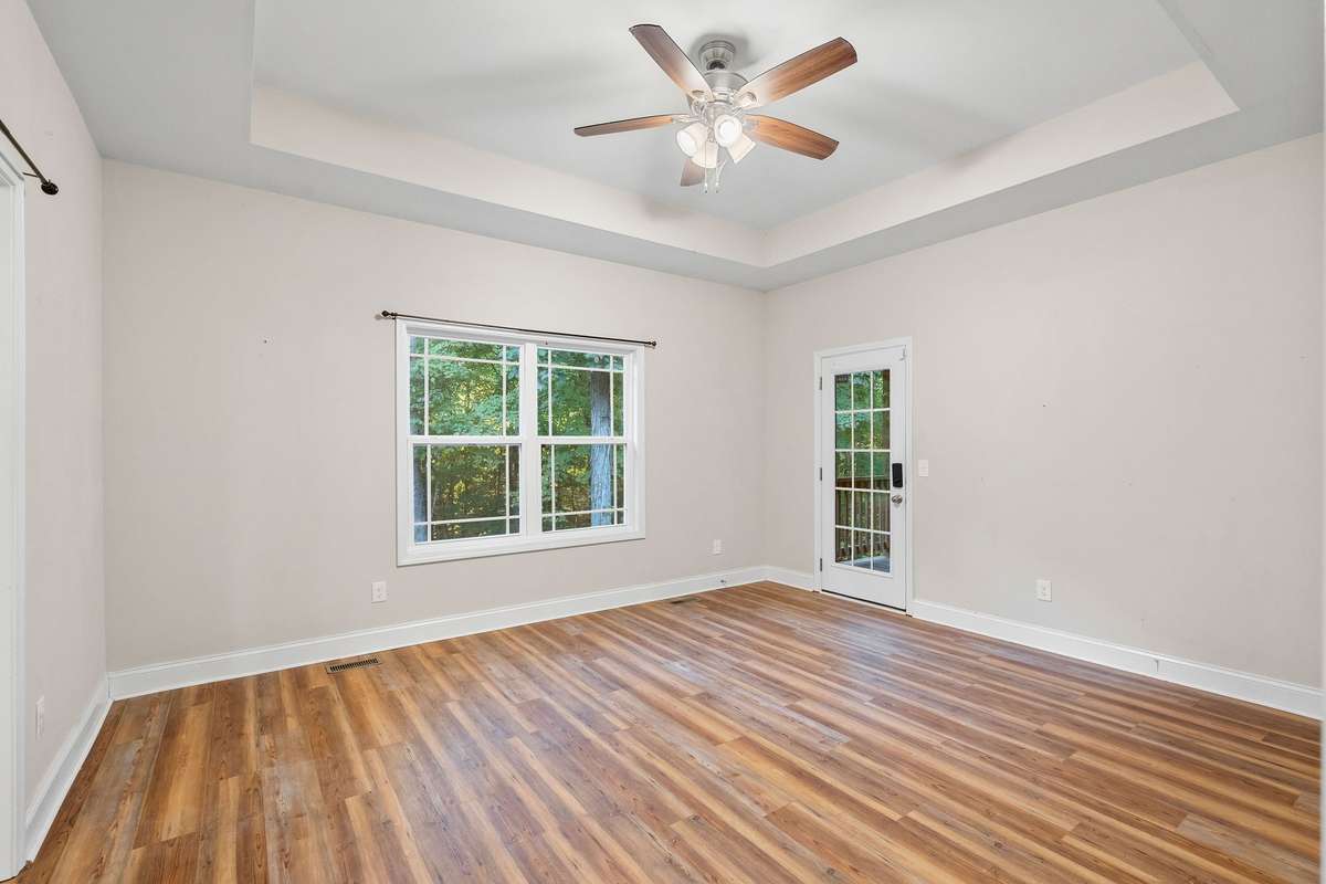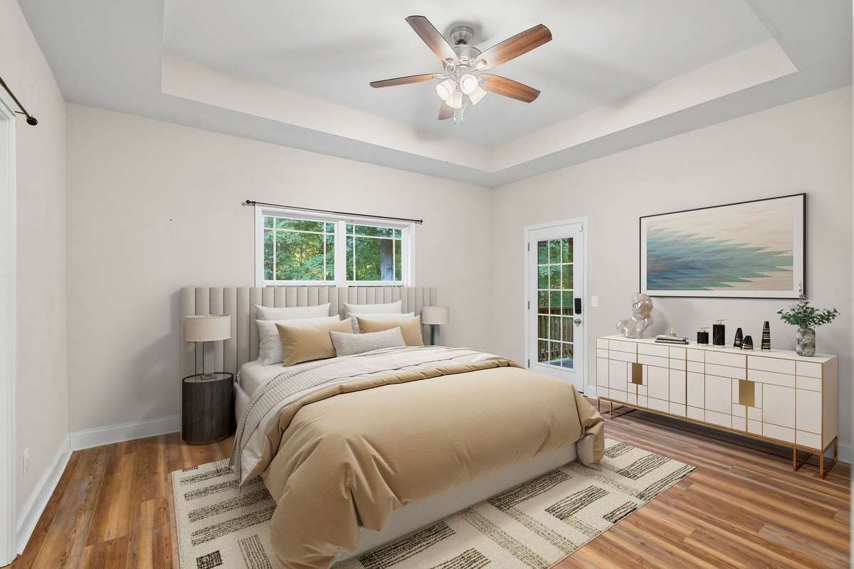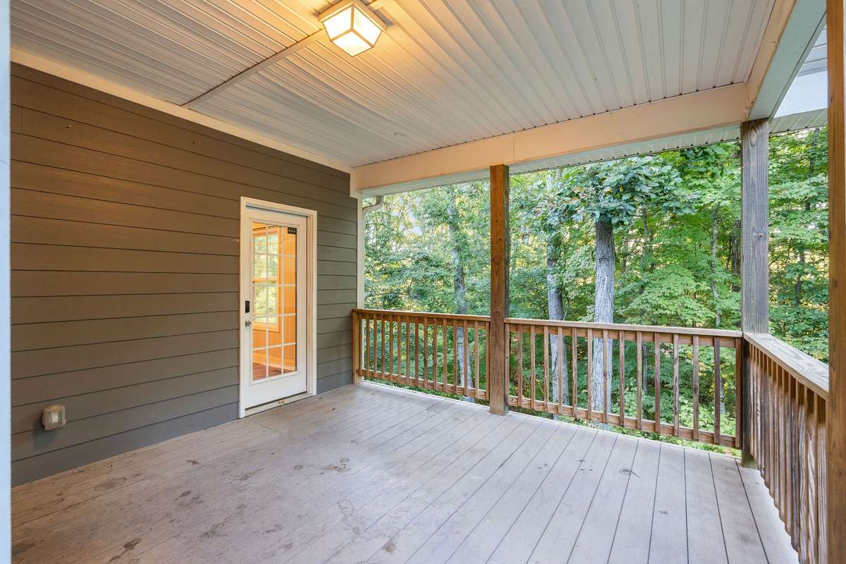 The Primary Suite is a spacious private retreat, offering a full en- suite bath with a separate tub and shower. A standout feature is its direct deck access, allowing you to step right outside onto the covered back porch overlooking serene woods and a creek—it' s the perfect spot for unwinding.