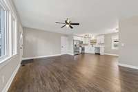 Beautifully refinished original hardwood floors showing off in the large living room (view from kitchen).