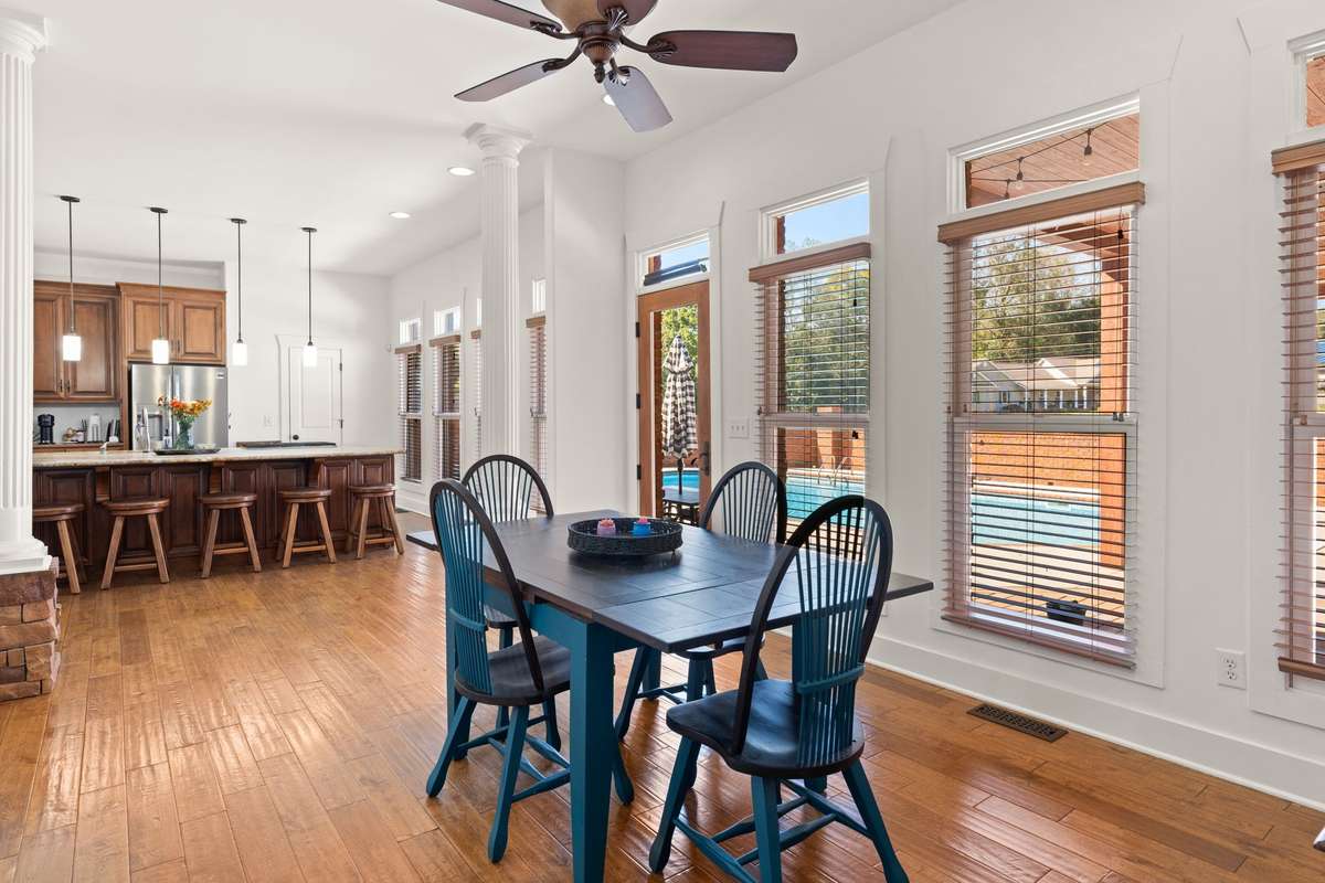 Welcome to 1275 Heather Way where you can find the most beautiful lake views year- round! Step inside this all- brick 4 bed/ 2. 5 bath home with custom touches throughout featuring vaulted ceilings, gorgeous hardwood floors, rock fireplace, and custom French wood doors that allow the option for open concept and steps into the heart of the home. The kitchen showcases leathered granite countertops that crown a large island, a double oven, gas cooktop, an ice maker, pantry, and an eat in dining room that is surrounded by windows, filling the room with natural light. Relax in the spacious master suite, featuring a walk- in closet and bathroom with a double vanity, soaking tub, and a walk- in shower. With 3 other generously sized bedrooms, there is no shortage of space here. A flex room downstairs offers versatile space for a home office or 5th bedroom, while upstairs features a bonus room for extra living or entertaining space. Step outside to your own private oasis, complete with a heated saltwater pool and a spacious patio- perfect for year- round use. Don' t miss this opportunity to live in this quiet, charming lake neighborhood.
