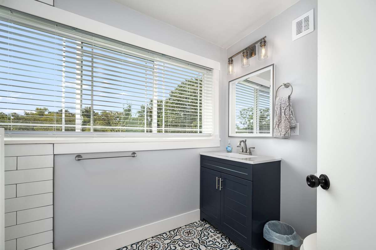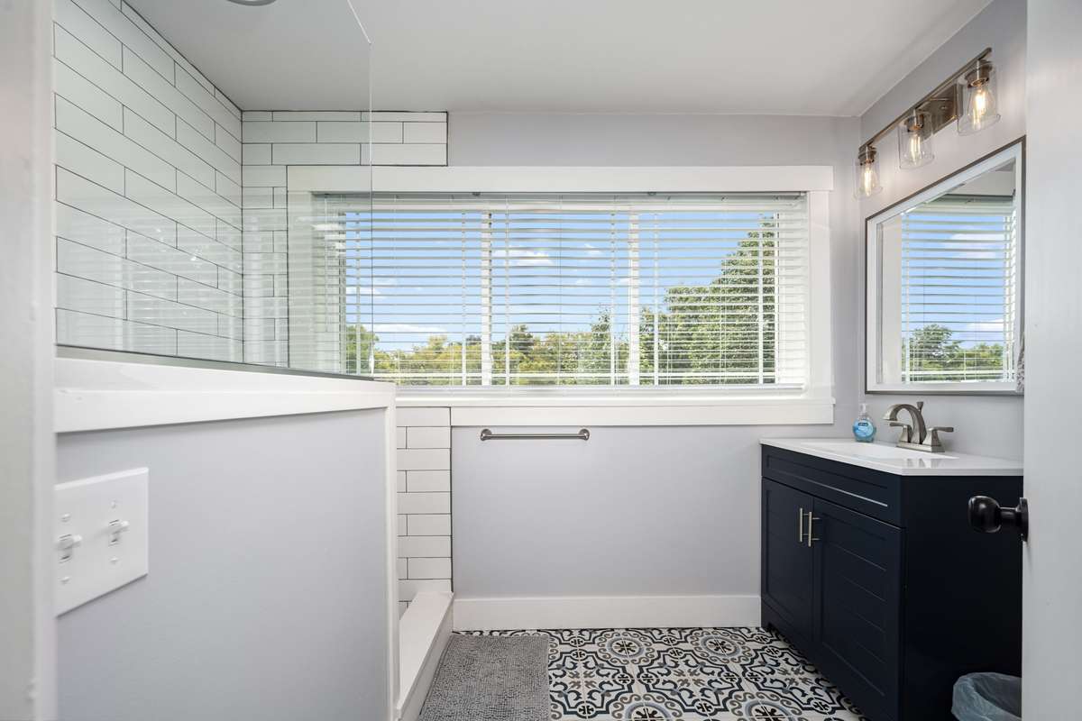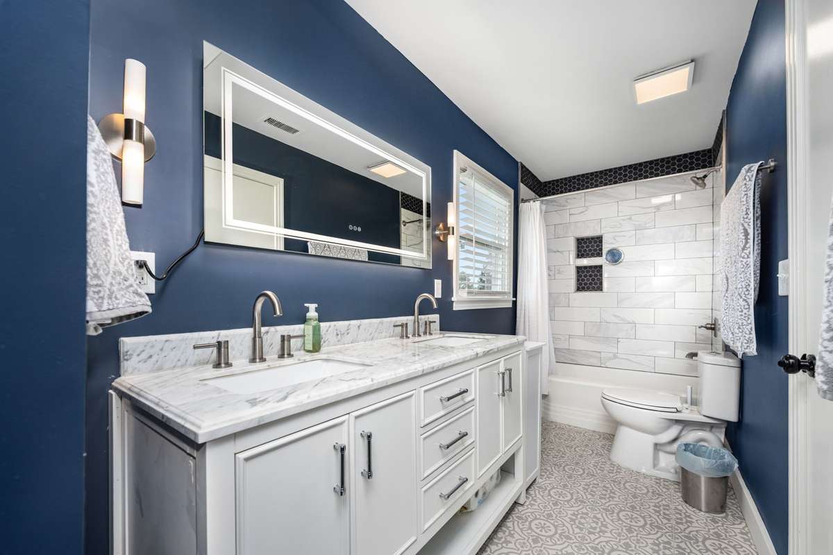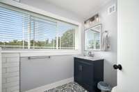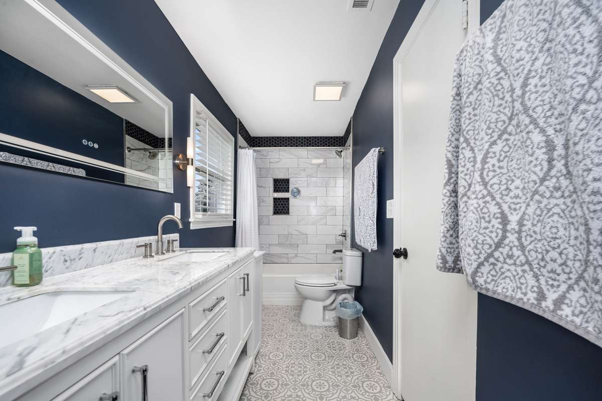 Updated secondary bathroom located off the flex room features patterned tile flooring, subway-tile shower surround, and a sleek navy vanity with modern lighting.