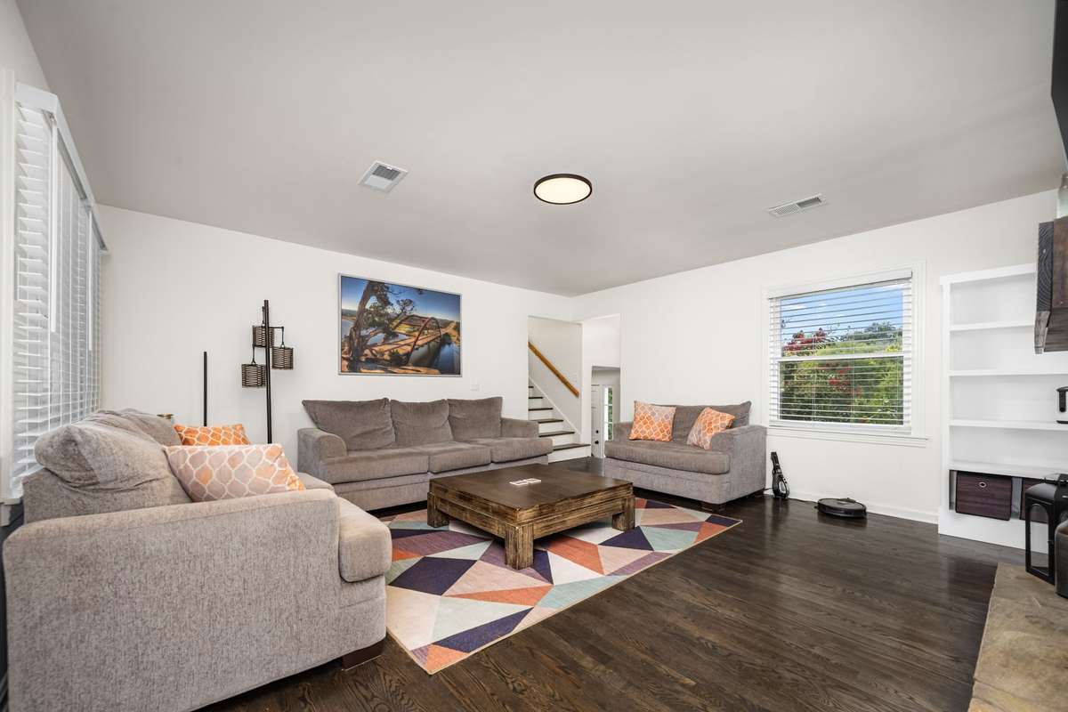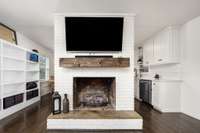 Spacious living room with a white brick fireplace, hardwood floors, and large windows for natural light.