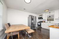 Updated kitchen with white cabinetry, subway tile backsplash, and stainless steel appliances