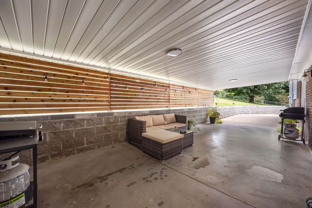 Covered patio with wood privacy accents, ideal for outdoor seating and entertaining
