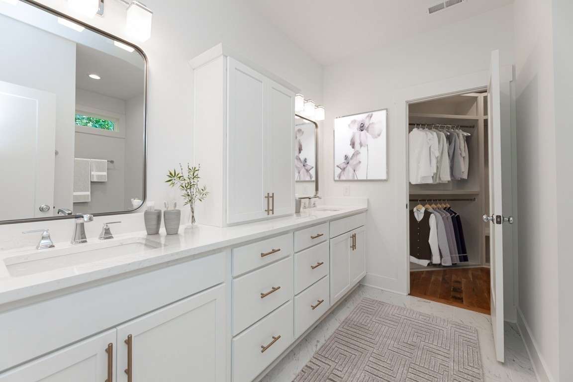 In the primary bedroom, the spacious shower and double vanity in the ensuite bath offer a spa- like experience, while custom closets throughout the house provide thoughtful storage solutions for a clutter- free lifestyle. A convenient 1- car garage and additional parking space accommodate your vehicles and storage needs.