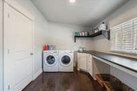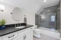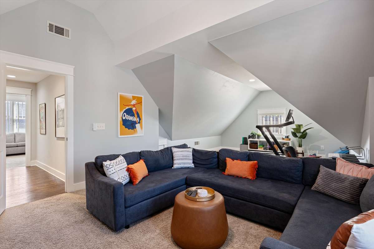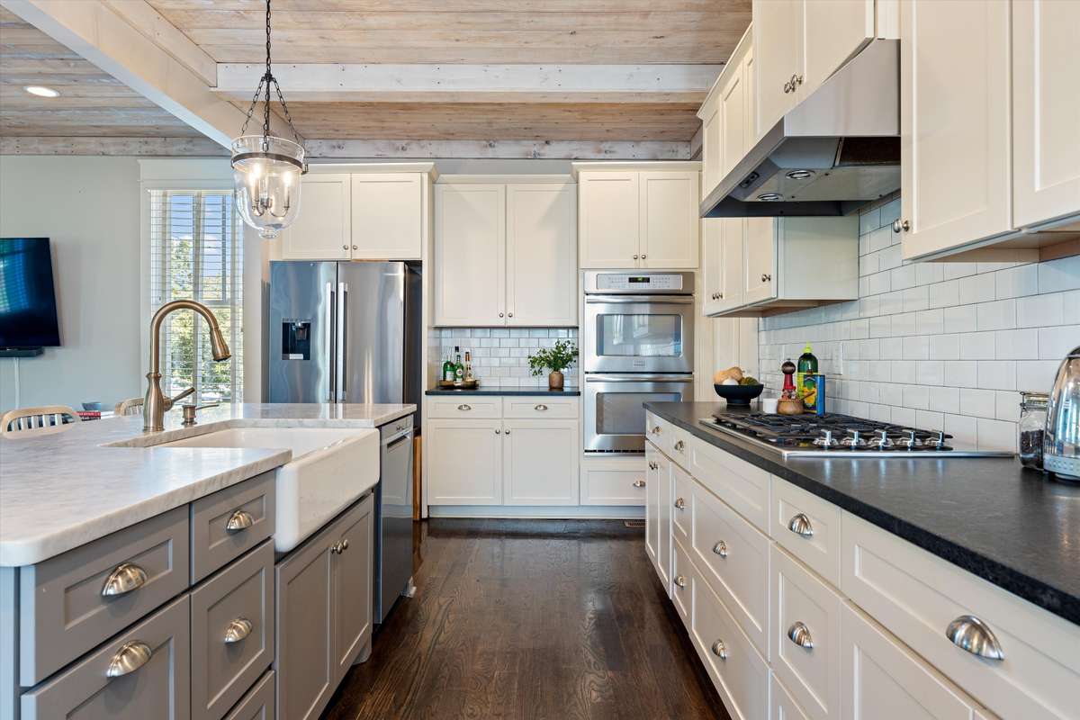 Originally built in the 1930s and fully reimagined by Building Masters in 2013, the 3, 106 sq ft plan marries classic charm with modern utility. Beamed ceilings, hardwood floors, and generous natural light set the tone, while the kitchen’s sleek stone countertops, pendant lighting, and farmhouse sink open into a comfortable main living area that invites conversation. The primary suite rests on the main level, joined by three additional bedrooms, multiple gathering zones, and a flex room suited for office, play, or guest use.