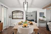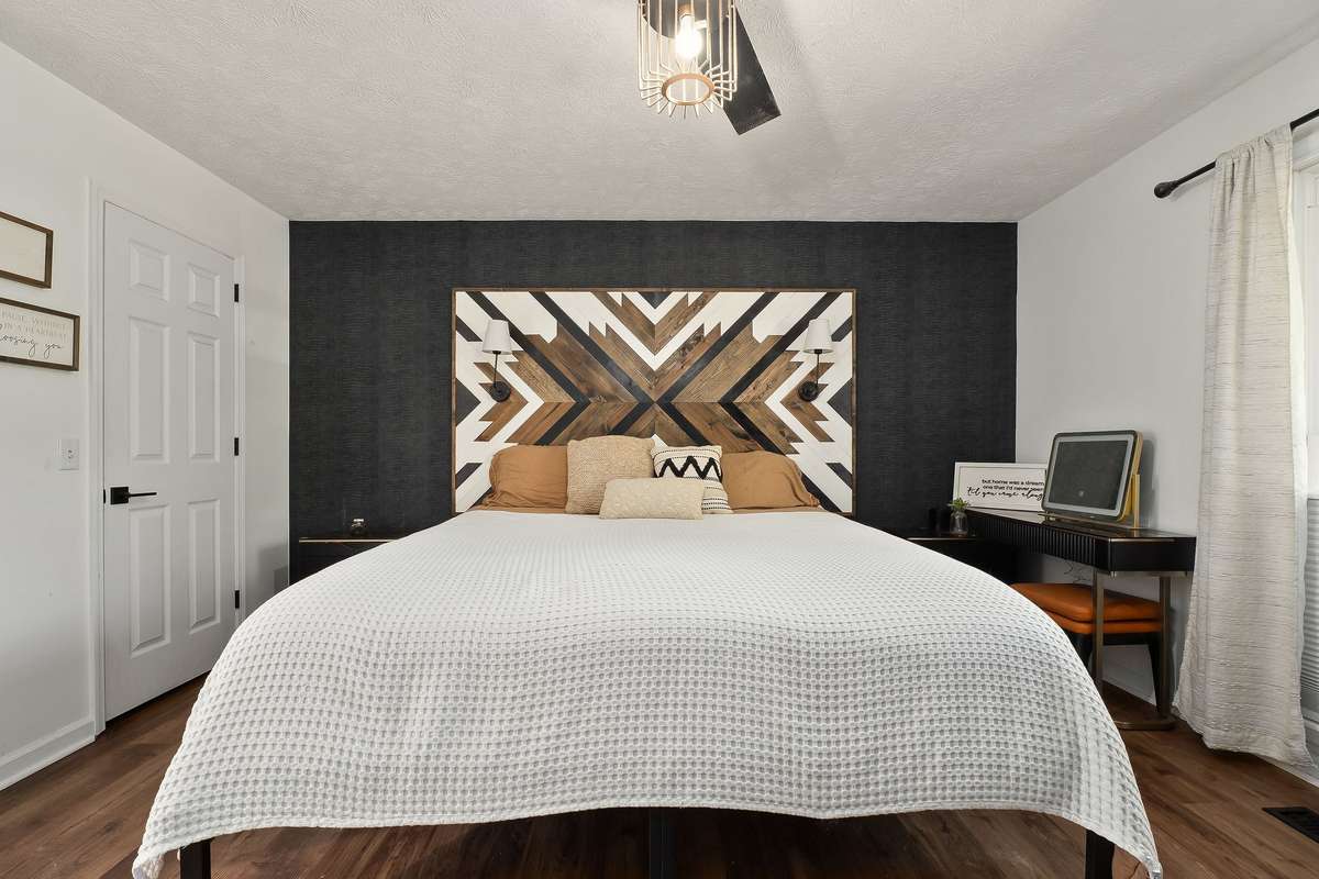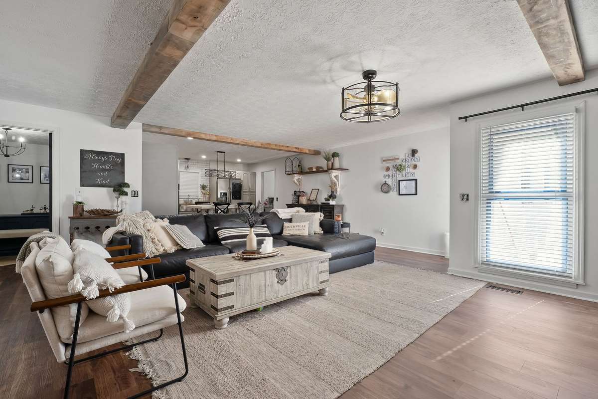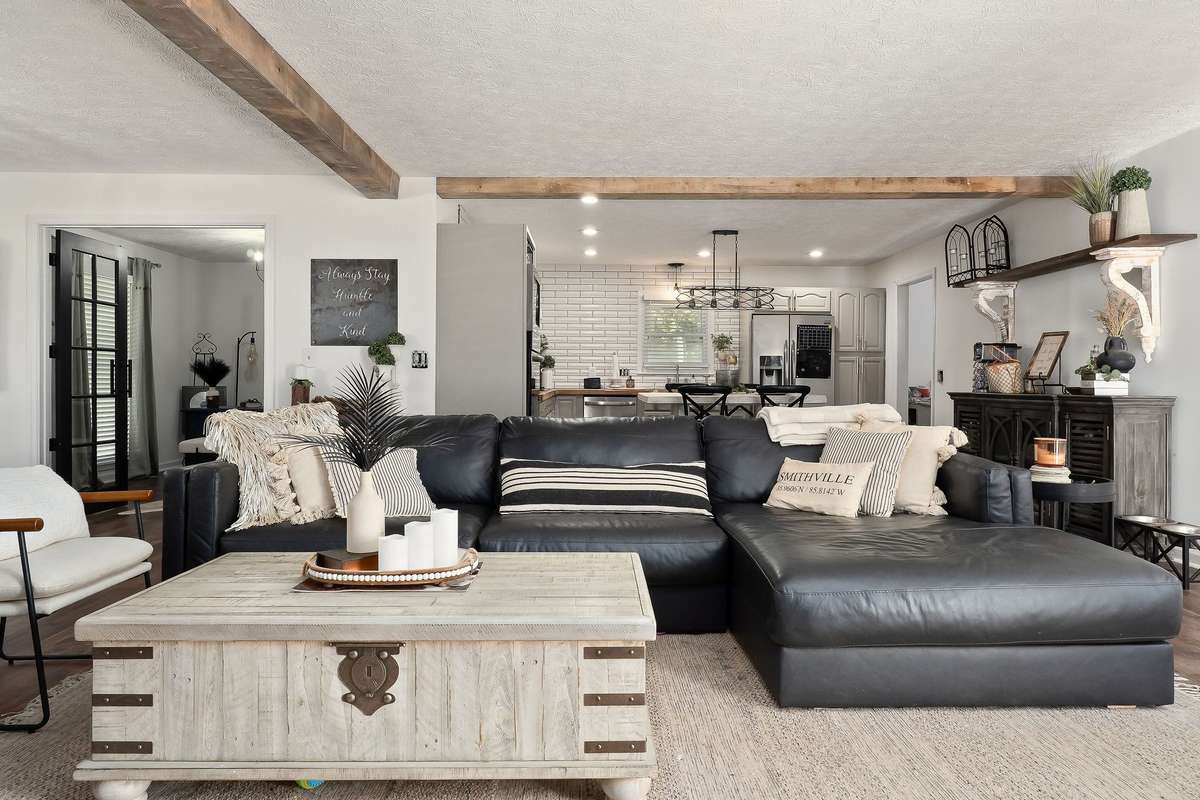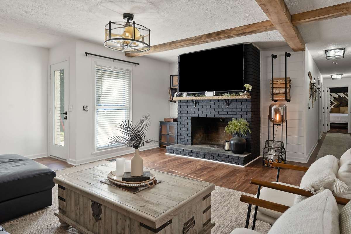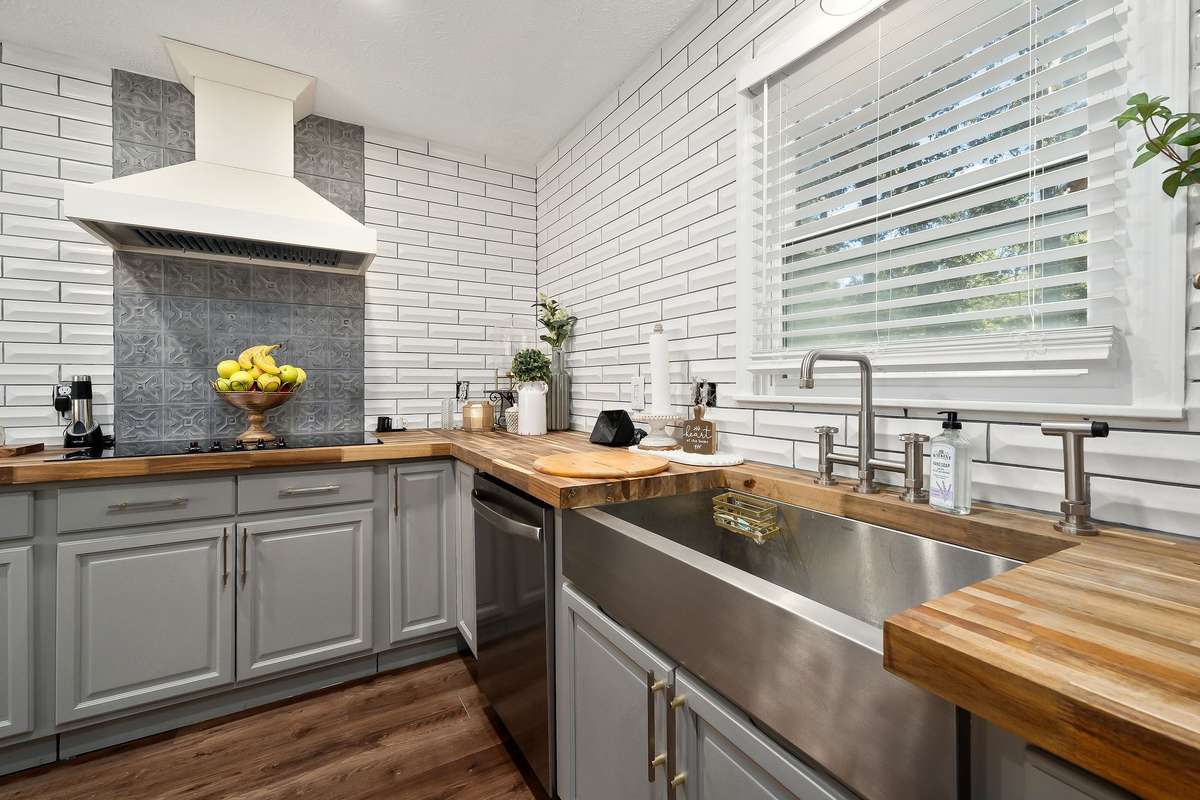 Step inside to an expansive open- concept living space that seamlessly blends rustic charm with modern luxury. The kitchen is a chef’s dream—featuring double ovens, a deep farmhouse sink, 2” thick butcher block countertops, and striking tile that extends to the ceiling. Custom wood beams, crafted from locally sourced lumber, add warmth and character to the living area, while continuous designer LVP flooring flows throughout the entire home.