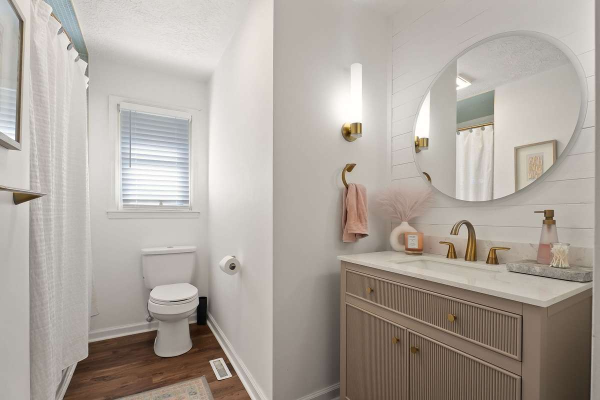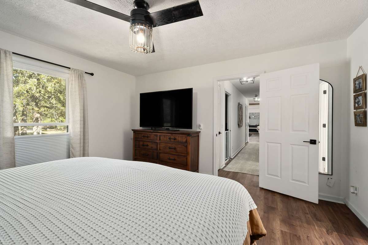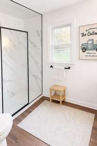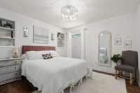The spacious primary suite offers a spa- like retreat with a double farmhouse vanity, elegant walk- in shower, and an enormous walk- in closet outfitted with custom rails spanning both sides. Two additional bedrooms are generously sized, and the guest bathroom impresses with a fully tiled tub/ shower combo, dual flush toilet and boutique vanity.