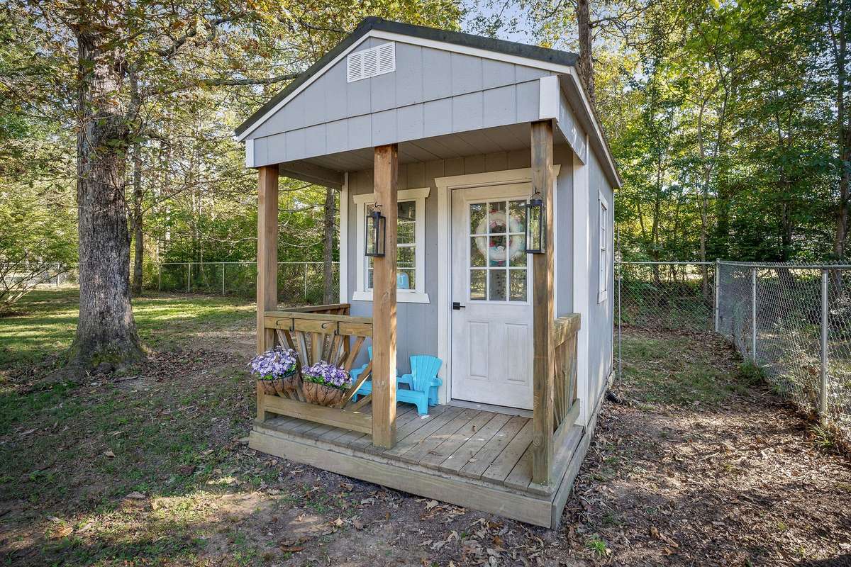 Outside, the charm continues. Enjoy a large fenced in area with a finished outbuilding, complete with LVP flooring—perfect as a luxury dog suite or upscale playhouse. An additional outdoor shed provides extra storage. The large wood deck and a massive outdoor firepit, bordered by authentic Smithville creek boulders, is the ultimate gathering space for entertaining.
