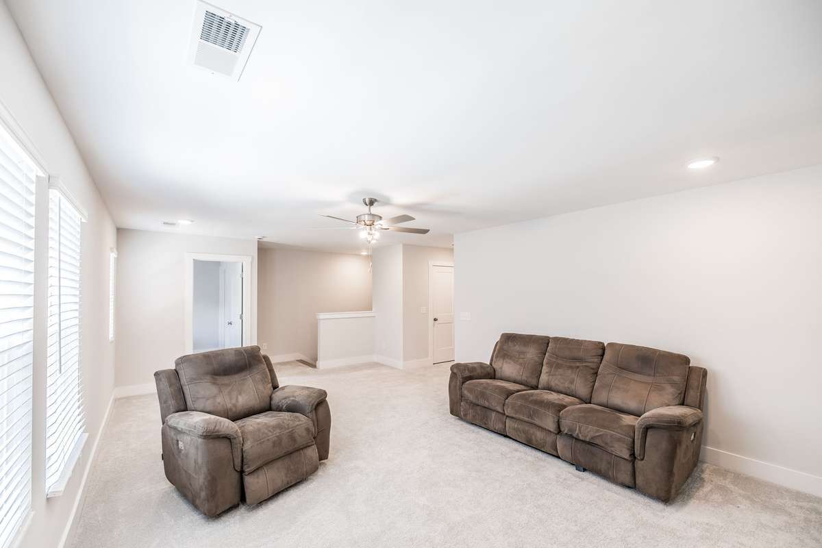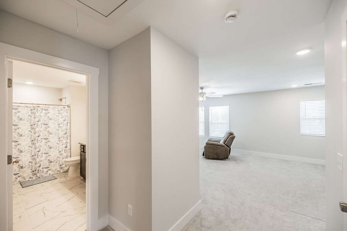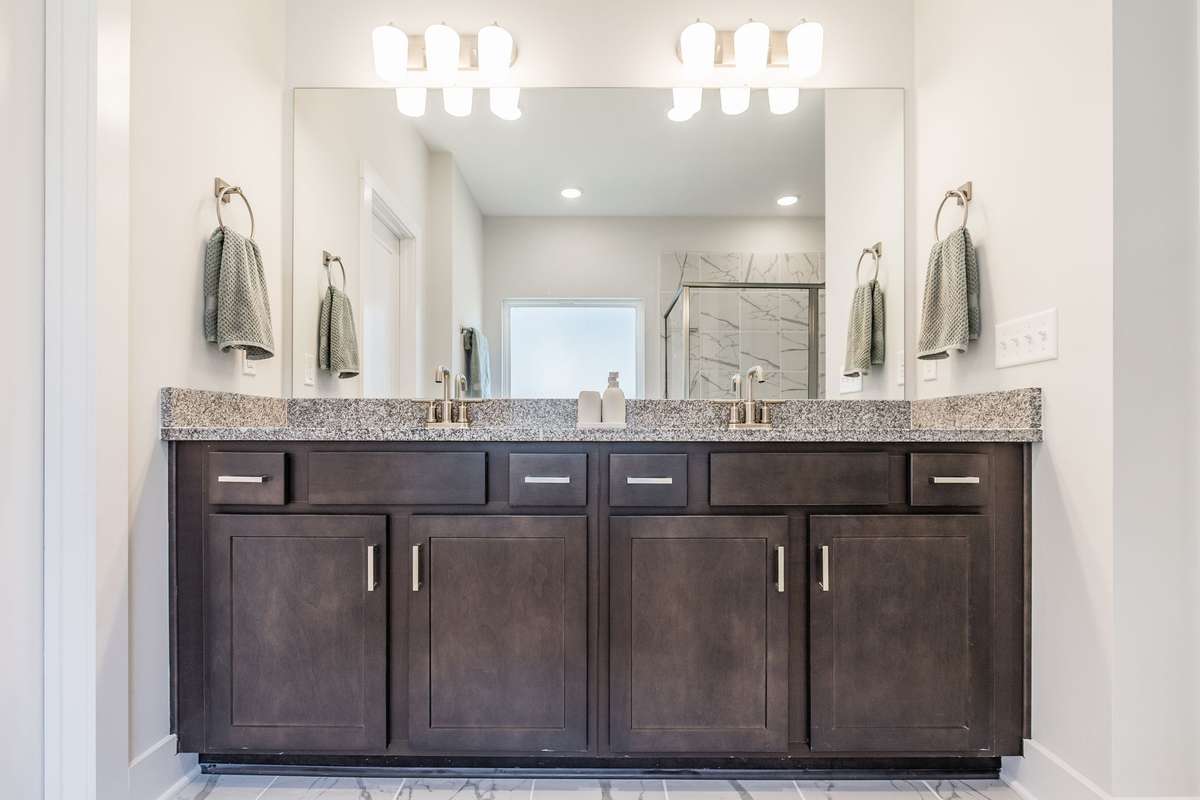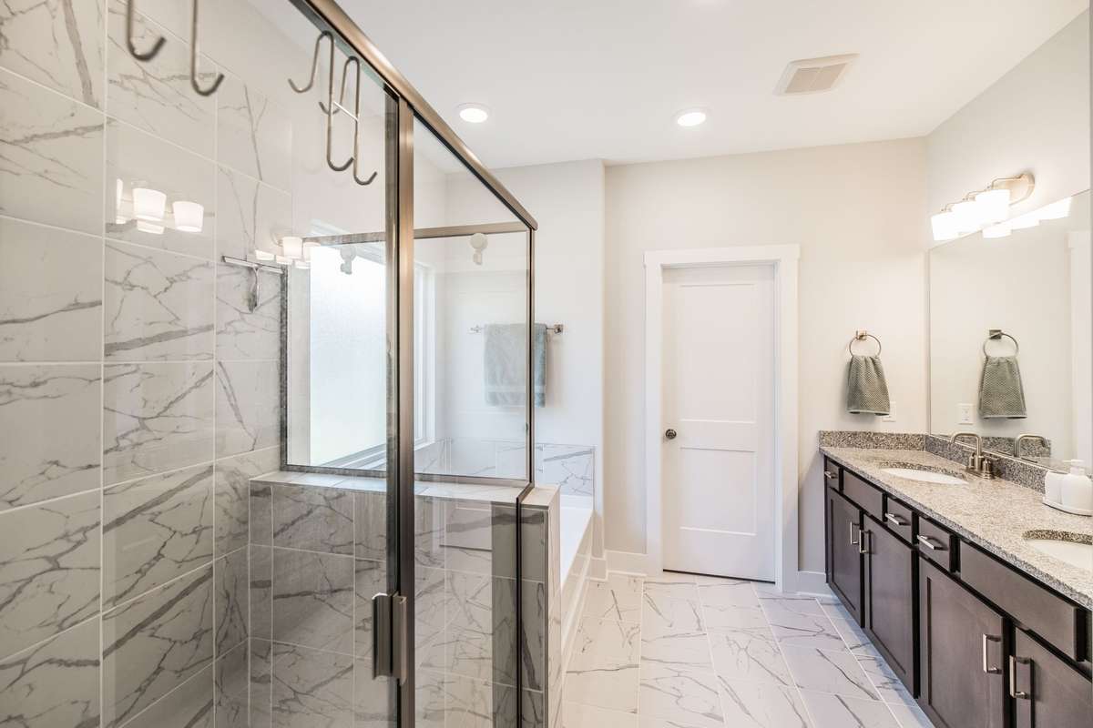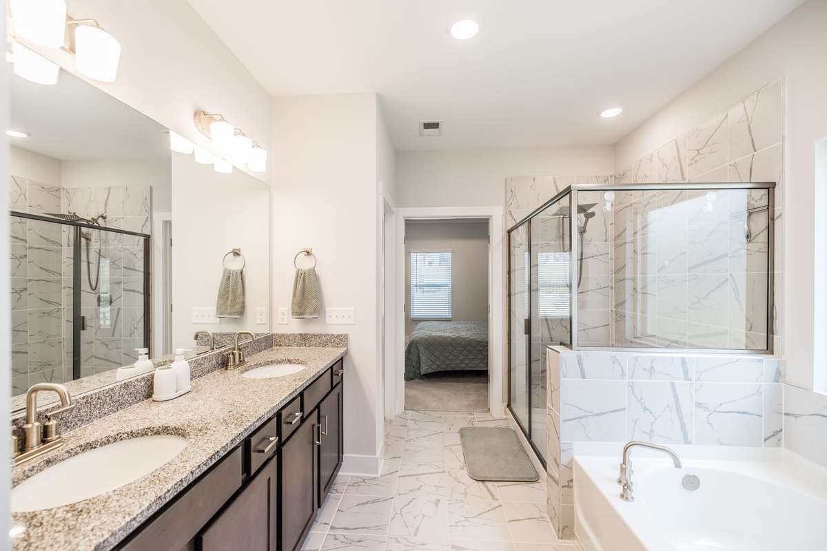 The primary suite offers a peaceful retreat with a soaking tub, walk- in shower, and dual vanities. Upstairs, each bedroom includes a walk- in closet, and an oversized bonus room provides endless flexibility for play, media, or guest space.