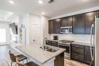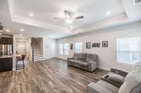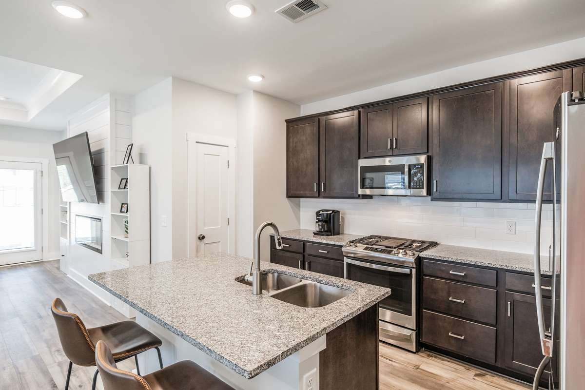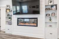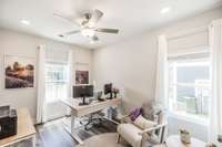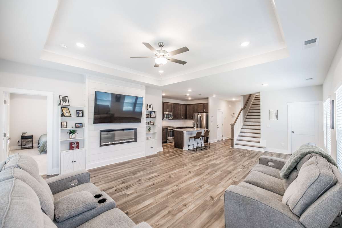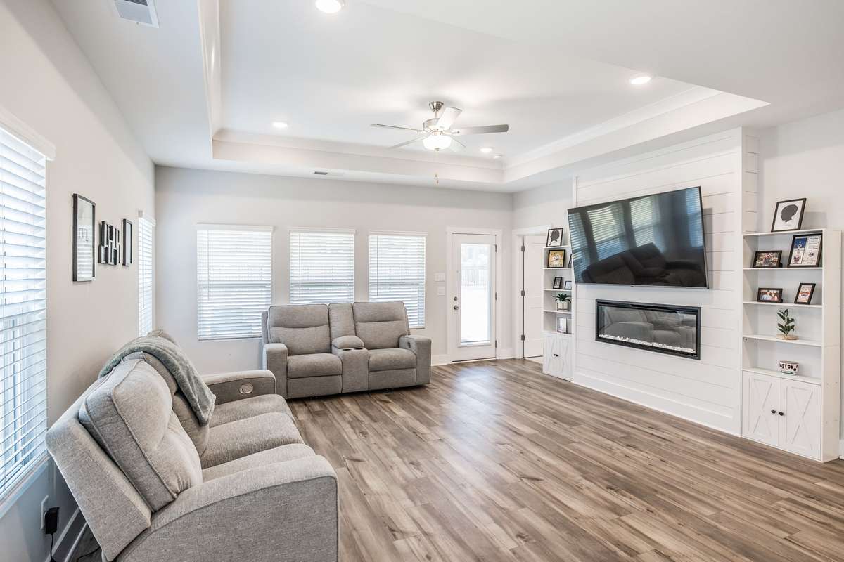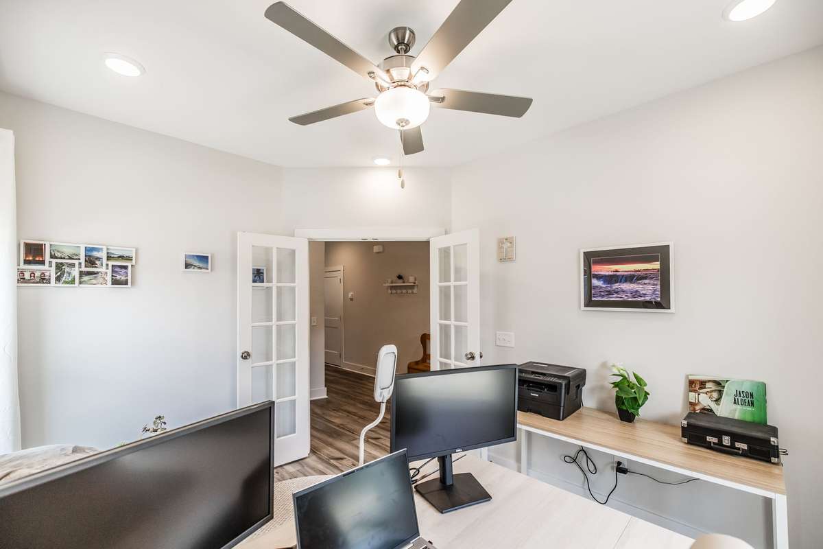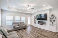 Step inside to a bright, open floor plan featuring a spacious living area with a custom electric fireplace and a dedicated front office—perfect for working from home. The gourmet kitchen is built for entertaining, complete with a large island, gas range, and generous pantry.