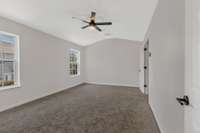 Large windows fill the home with natural light and showcase serene views of the lush surroundings. Step outside to your private patio—ideal for morning coffee or evening cocktails. Both bedrooms are generously sized, with the primary suite featuring a walk- in closet and a private en- suite bath.