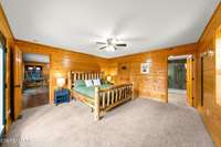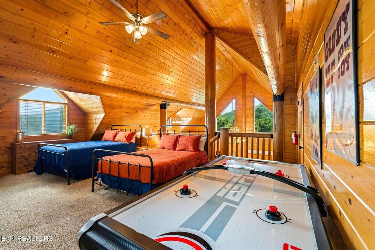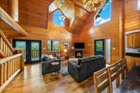 Step inside and you' ll love the warm cabin vibes, complete with wood- paneled walls, exposed beams, and vaulted ceilings that fill the home with charm and character. The kitchen features stainless steel appliances, and the main- level suite offers a private retreat with a dual vanity ensuite bath. Upstairs, the loft provides a fun space with a game table, extra sleeping area, and even its own private balcony.