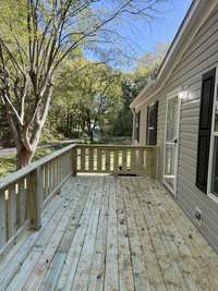 The primary suite includes a private en- suite bath and walk- in closet. Additional highlights include luxury vinyl flooring throughout, a secondary living room, and a large back patio ideal for entertaining or relaxing in privacy among mature trees.