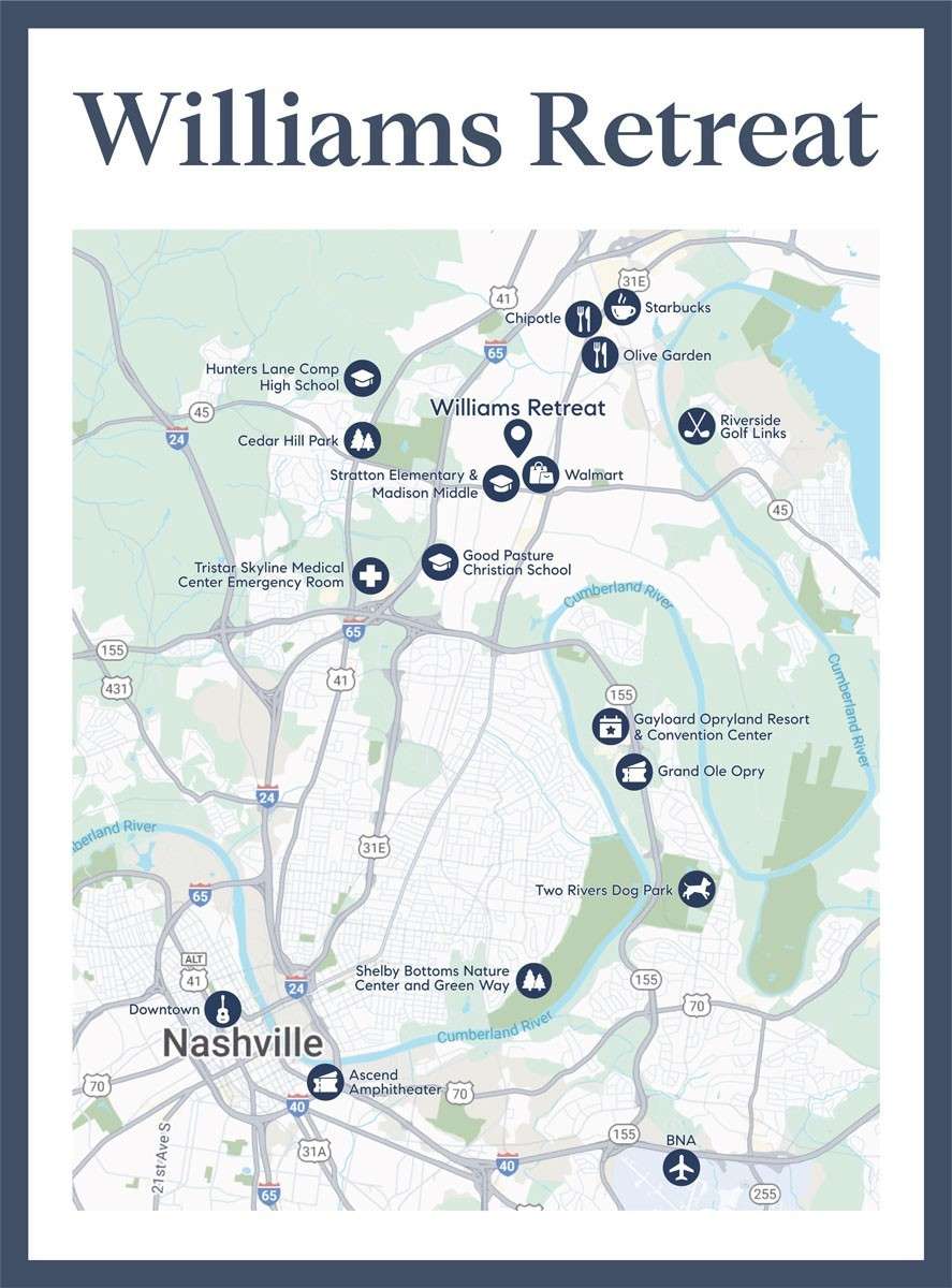 From I-65 N, Take exit 92, Right on Old Hickory Blvd, Left on Gray Ave, Right on Pima Rd, Left on Walker Terrace, Right on Williams Ave, On the Right
