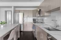 Built in 2018, the home features modern finishes throughout—including sleek quartz countertops, stainless steel appliances, a large kitchen island, hardwood floors, and a tasteful backsplash. Large windows and a private balcony bring in natural light and views. High- speed internet, city water/ sewer and central heat and air keep everything simple.