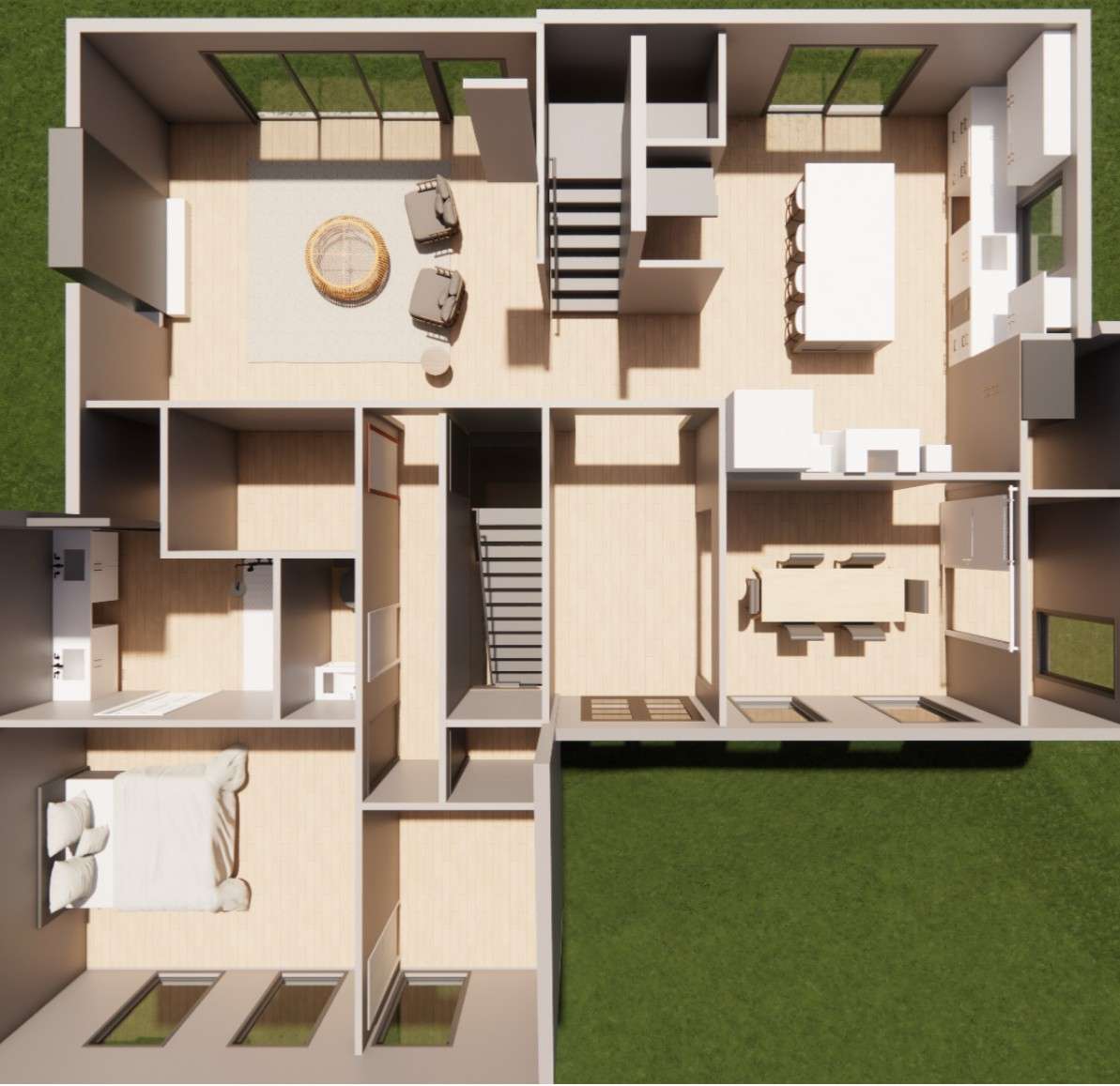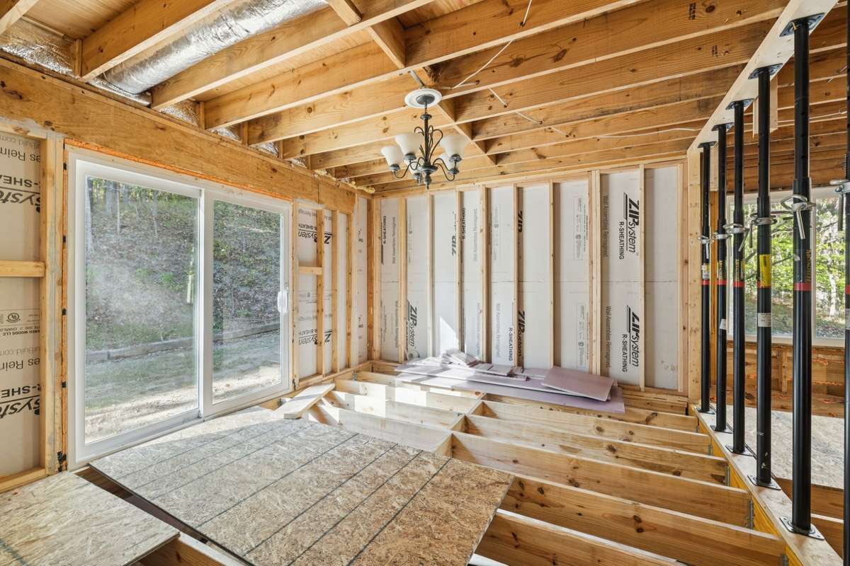 All- new flooring joists have been purchased and installed downstairs, setting the stage for your vision. If finished per the seller’s drawings, the home would include a large primary suite on the main level with a spacious walk- in closet, luxurious primary bath, a huge kitchen with island, and a formal dining room. The contemporary design features lots of windows overlooking beautiful trees and treed acreage, giving a true Gatlinburg- in- the- city feel.