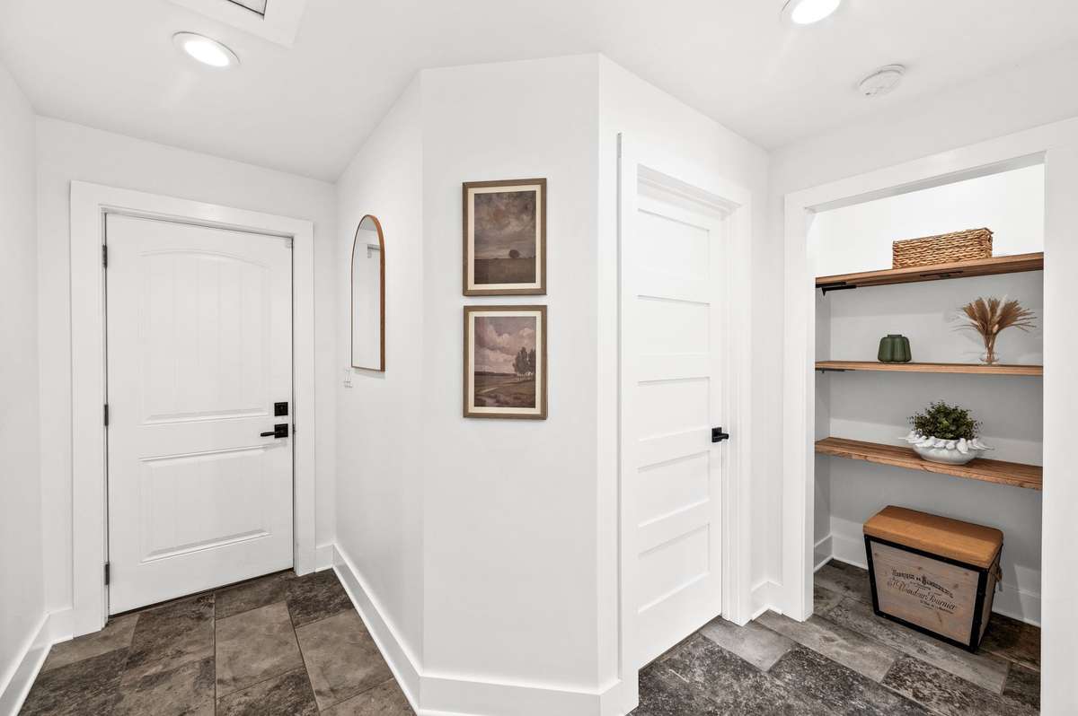 Perfect use for this space, conveniently located near the exit entry to the garage and patio area. There is a pull down access to the attic in the ceiling above in this picture.