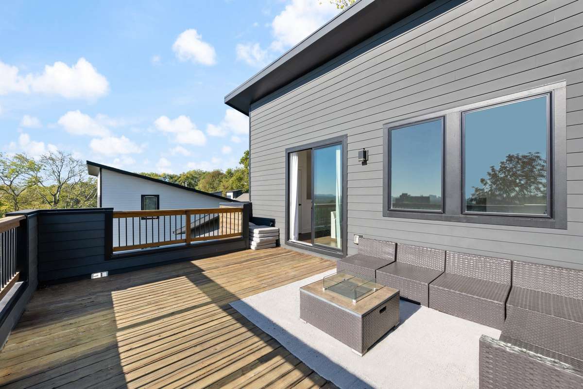 Tucked away from the street and next to the back of two long lots with tons of green and trees, this home maximizes privacy while still being centrally located with quick, easy access to all the main areas of Nashville. Custom home built in 2021 with marble countertops and custom tile throughout, upgraded kitchen appliances, wide plank hardwood floors, 9’ ceilings, and an open concept living with enlarged windows that maximize natural lighting—dining, and kitchen with enough space for a large dining room table. Large rooftop deck and private deck off the primary suite, plus a fenced- in backyard. Quiet, walkable neighborhood. Unmatched value, views, and versatility. No expense spared—modern, move- in ready, and primed for your lifestyle.