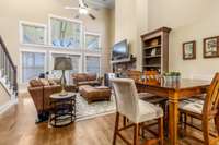 Step inside to find tall ceilings and a beautiful stone fireplace anchoring the spacious living room, which flows seamlessly into a dedicated dining area. The open layout continues with a generous kitchen featuring a buffet window overlooking the living room—ideal for entertaining or staying connected while cooking.