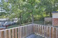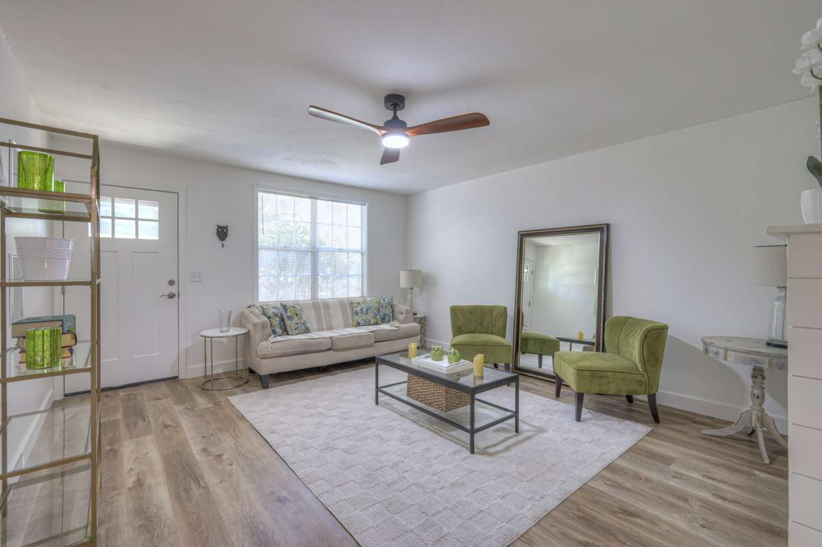 Enjoy seamless indoor- outdoor living with multiple spaces to unwind, including a welcoming covered front porch and a private decked back porch shaded by mature oak trees—perfect for morning coffee or quiet evenings outdoors. A new electric fireplace adds warmth and ambiance, while a convenient in- unit washer and dryer provide everyday ease without compromising design or flow.