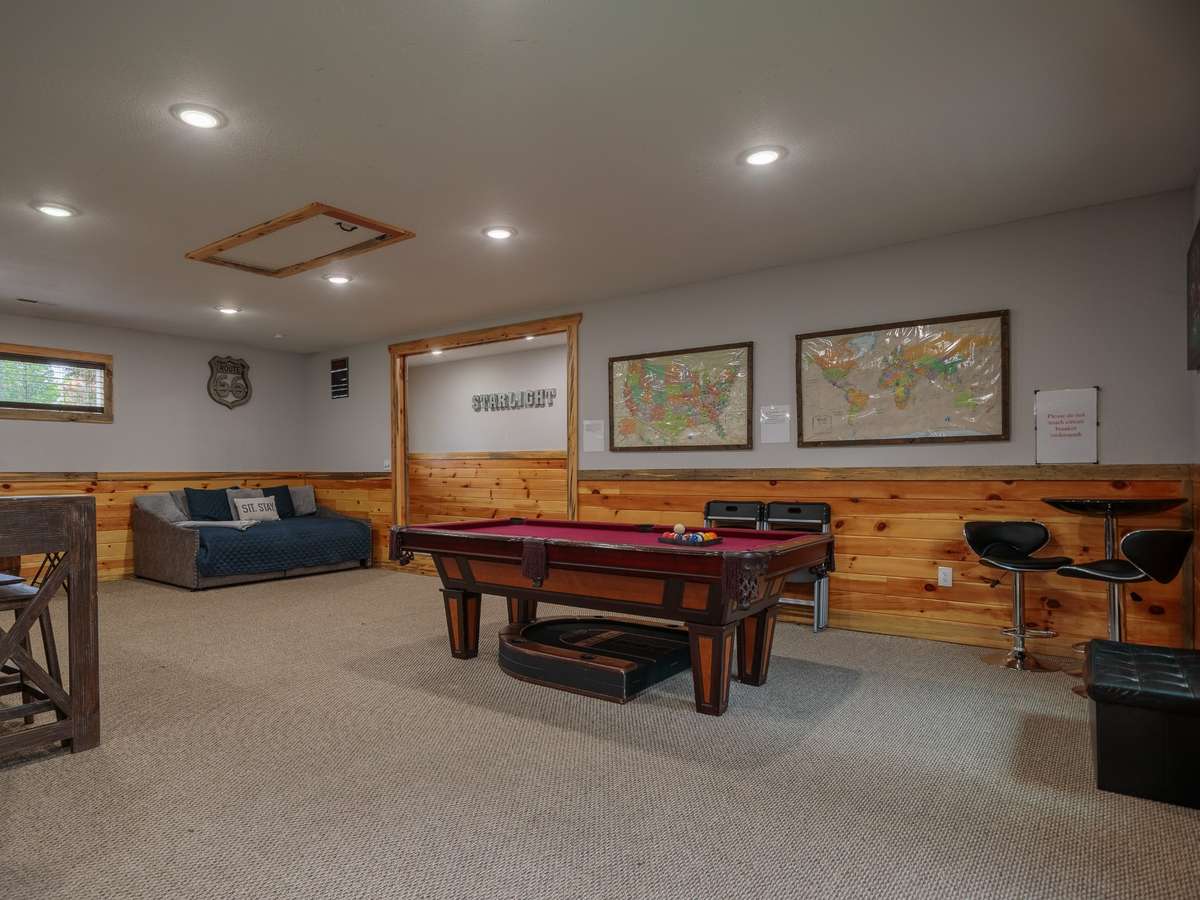 • Expansive game room + wet bar with bar sink and mini fridge