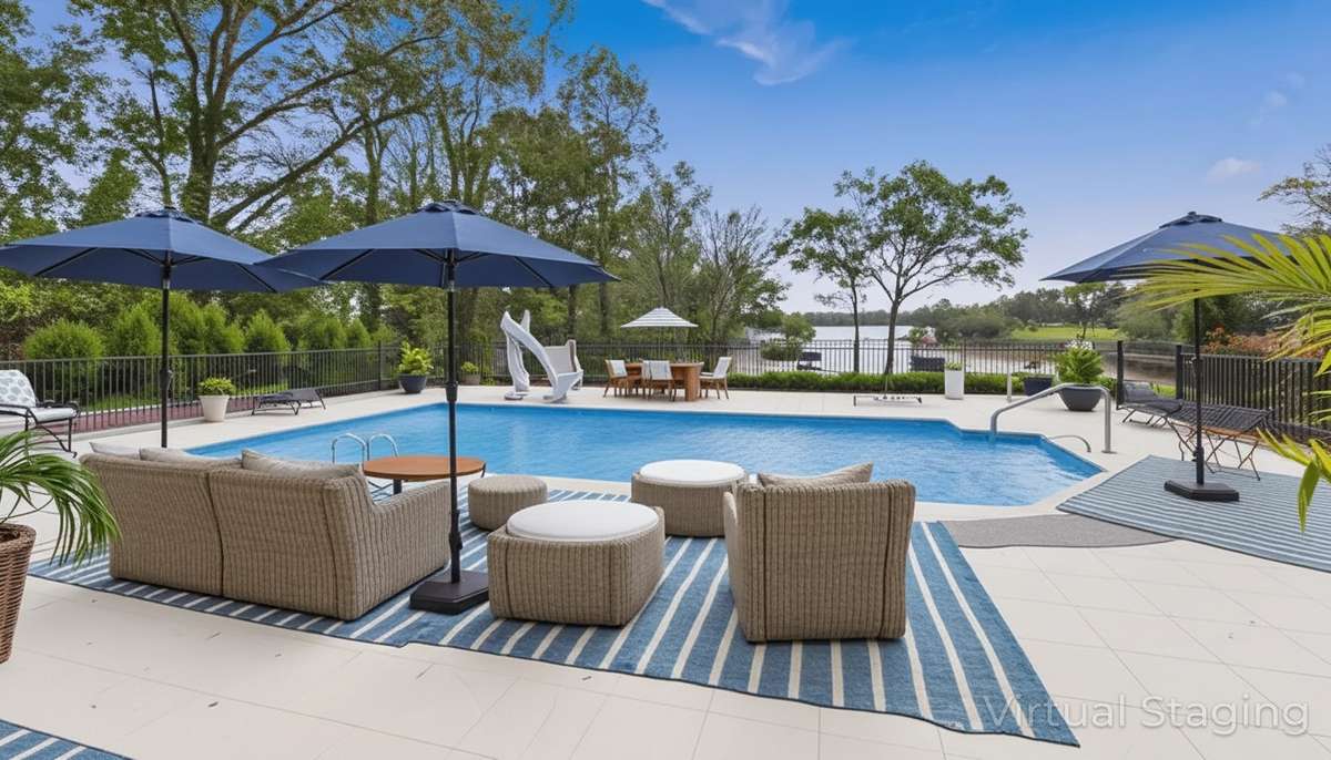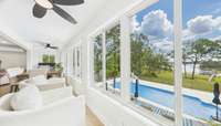This property is an entertainer' s dream with a heated saltwater pool surrounded by a vast area for hosting gatherings. The covered patio and outdoor fireplace provide a cozy ambience for evening relaxation, while the gentle slope leads down to a private dock, allowing direct access to the tranquil waters.