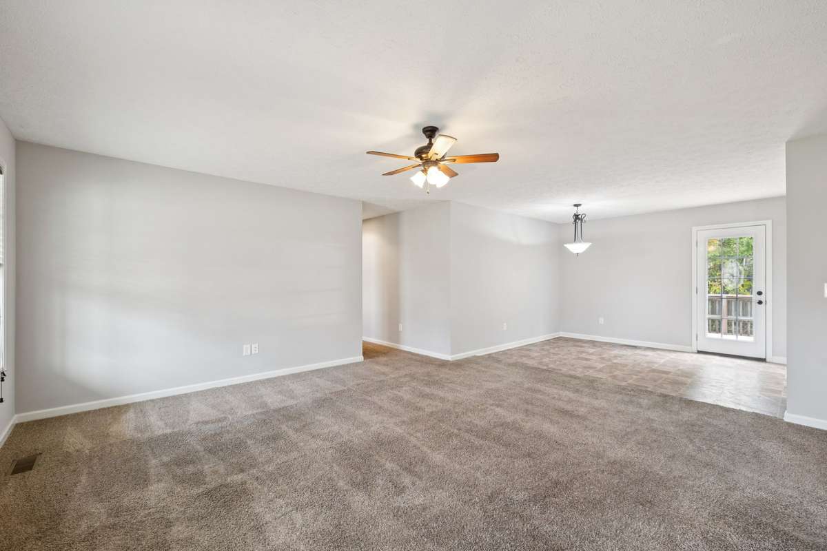 A concrete drive leads to a two- car garage and landscaped front yard. The home’s exterior blends light yellow siding with stacked- stone accents and dark shutters. Inside, an open- concept living and dining area features fresh paint, neutral gray walls, and plush carpet. The galley- style kitchen offers off- white cabinets, a double sink overlooking the backyard, and a full suite of stainless appliances.