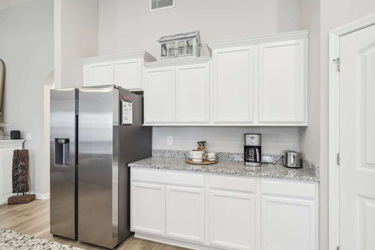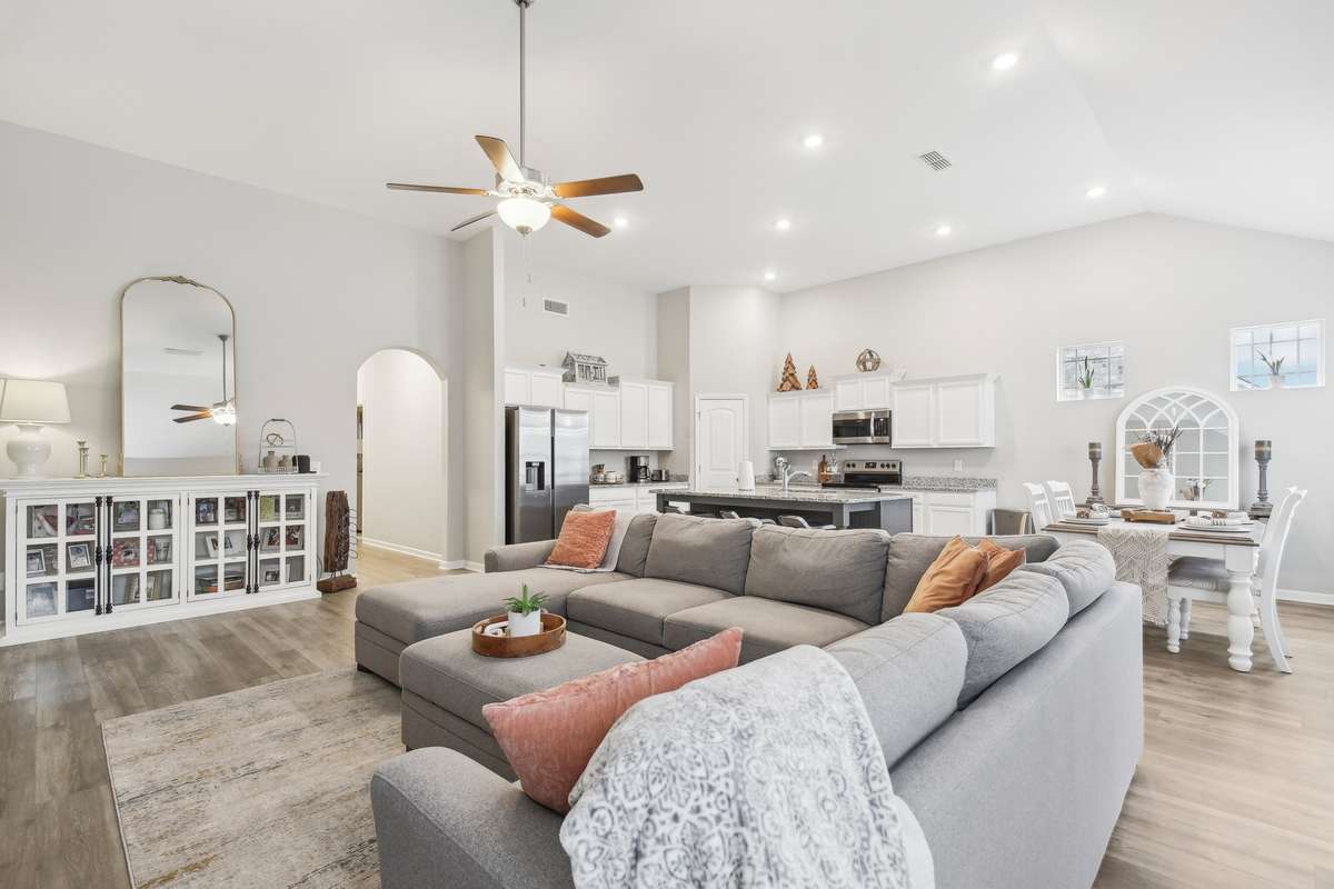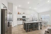 Welcome to this stunning home featuring a spacious open floor plan designed with both comfort and entertaining in mind. Soaring vaulted ceilings and abundant natural light create a bright, airy atmosphere throughout. At the heart of the home, the modern kitchen boasts a large granite island, ideal for meal prep, casual dining, or gathering with friends. Crisp white cabinetry offers a clean, contemporary look while providing plenty of storage.