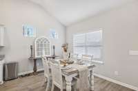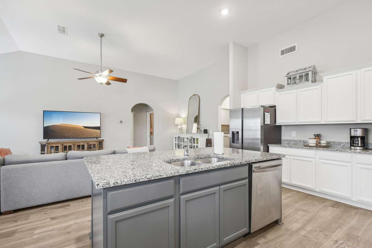 Welcome to this stunning home featuring a spacious open floor plan designed with both comfort and entertaining in mind. Soaring vaulted ceilings and abundant natural light create a bright, airy atmosphere throughout. At the heart of the home, the modern kitchen boasts a large granite island, ideal for meal prep, casual dining, or gathering with friends. Crisp white cabinetry offers a clean, contemporary look while providing plenty of storage.