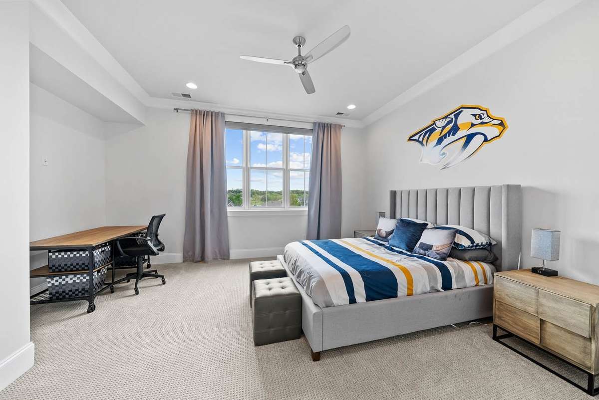 The chef’s kitchen is both functional and stunning, equipped with a granite waterfall island, double ovens, walk- in pantry, and wet bar — ideal for entertaining. A dedicated office, two laundry rooms, an upstairs playroom, and a finished lower level with a full entertainment lounge, fitness studio, and rec space provide flexibility for every lifestyle. Three bedrooms are located on the upper level, with a fourth suite privately situated on the lower level.