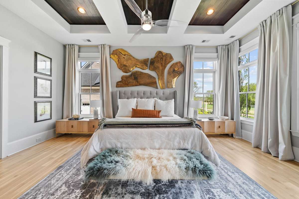 Elegance and craftsmanship define every detail, from white oak coffered ceilings and hand- troweled plaster walls to bespoke built- ins and designer lighting. The main- level primary suite is a private retreat with brick and wood architectural accents and a spa- style bath featuring a steam shower and high- end finishes.