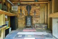 The landscape unfolds into wooded walking trails, a serene pond, and thoughtfully placed structures designed for both work and reflection—a detached office with a split system for year- round comfort, a charming she- shed overlooking the water, and a workshop with a wood stove for projects or creative pursuits.