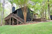 Inside, the 3- bedroom, 2. 5- bath home balances rustic character with modern design. The newly remodeled kitchen features open shelving and a handcrafted bar top made from wood harvested on the property, seamlessly connecting to the main living area where a grand stone fireplace originally built by an Appalachian bear hunter, anchors the space with warmth and history. Natural textures, new wood flooring, and artisan tile work create an atmosphere that feels both grounded and elevated.