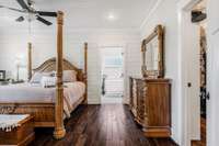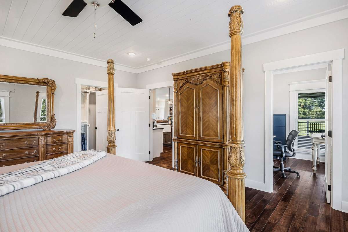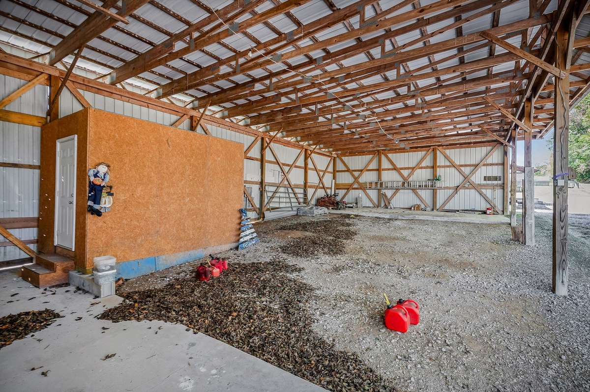 Interior highlights include custom trim work, detailed shiplap ceilings, gas fireplace, upgraded windows, and quality finishes throughout. Exterior features Hardie board siding, covered front porch, and a large covered back porch with tongue- and- groove ceiling overlooking the barn and property.