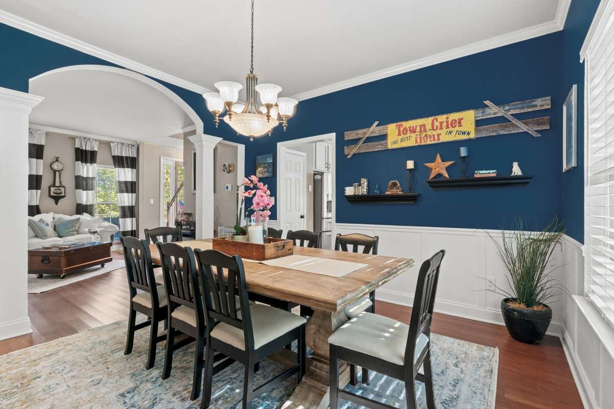 The dining room features newly added board-and-batten trim and fresh paint, with a large window overlooking the backyard and filling the space with natural light