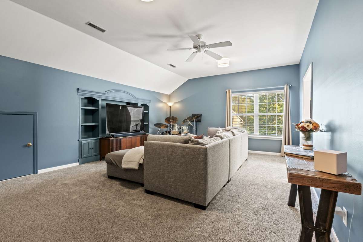 The upstairs bonus room is full of space and extra storage, located near the bedrooms and hall bath—making it an easy option for a fifth bedroom if needed