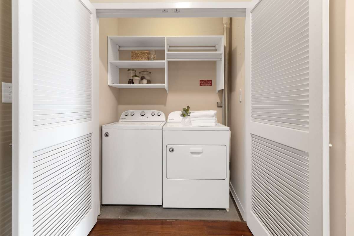 The hits keep coming with an ultra-convenient laundry area. Smartly tucked away in the entry hallway. This thoughtful placement keeps it separate from main living spaces. Complete with storage shelves to enhance the homes functionality.