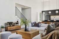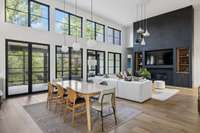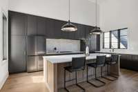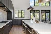 Completed in 2023, the home offers over 5, 300 square feet over 3 stories and a 623 sq. ft. detached studio. From its sleek exterior lines of stucco and crisp architectural detailing to its tasteful landscaping, the curb appeal is strong and hints at the high level of finish found within. Engineered hardwood floors flow seamlessly throughout the main level and abundant natural light pours in. The expansive kitchen anchors the home, featuring Opus Luxury Cabinets, dual ovens and a large pantry, hidden by walk- through cabinet doors. The main floor also showcases a family room with a venetian plaster fireplace and a wall of windows overlooking the screened porch and private landscape of the neighborhood.