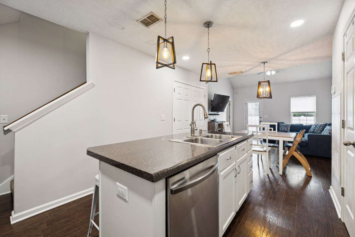 This move- in ready 4 bedroom 3 bathroom end unit in Florence Village offers a smart layout with two bedrooms on the main floor, perfect for guests or multigenerational living. Freshly painted and filled with natural light, the home features updated light fixtures, ceiling fans, and laminate flooring throughout the main level. The kitchen includes an island with storage, a breakfast bar, a pantry, and newer Samsung stainless steel appliances.