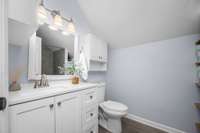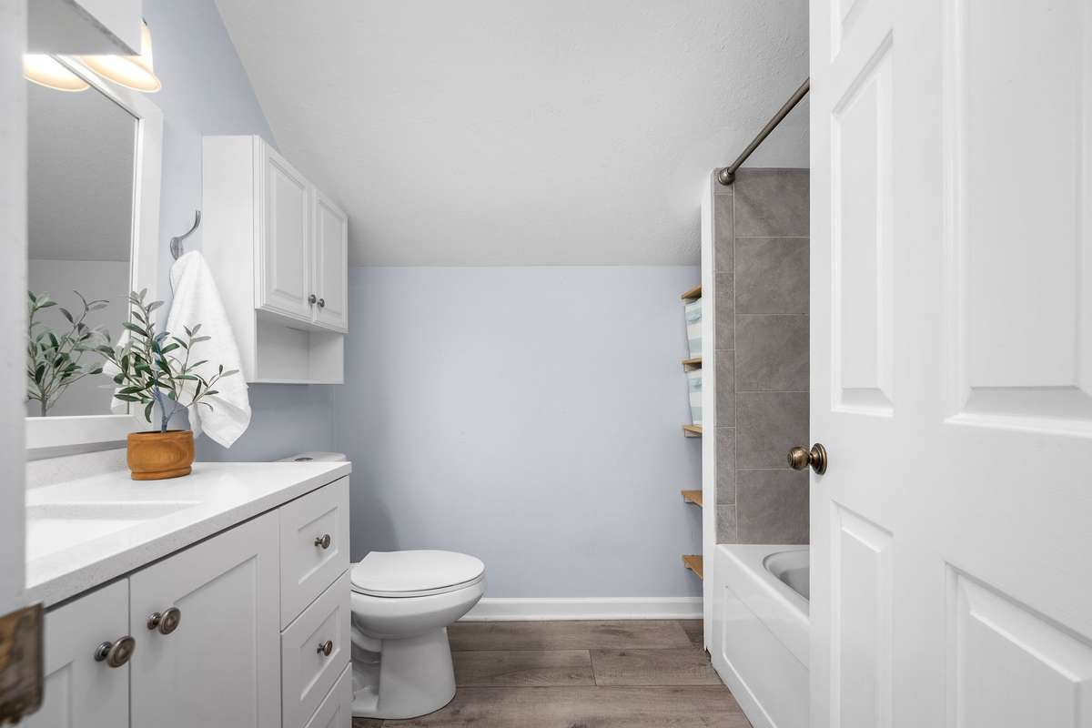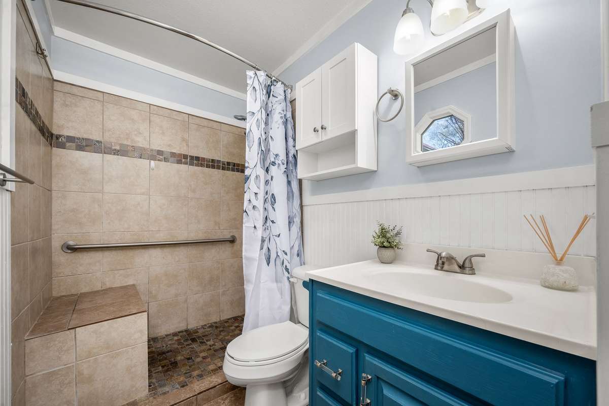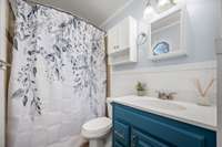 The home is equipped with energy- efficient windows (~ 2018) , new ceiling fans in every room, new light fixtures throughout, new blinds, and custom shutters in the primary bedroom. Upstairs, enjoy an oversized soaking tub — the perfect retreat after a long day.