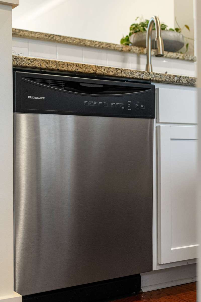 As you step inside, you' ll be greeted by a seamless open floor plan that invites natural light to illuminate the sleek hardwood floors found throughout the main level. The gourmet kitchen features modern white cabinetry, opulent granite countertops, white tile backsplash, and stainless steel appliances, making it a culinary enthusiast' s dream.