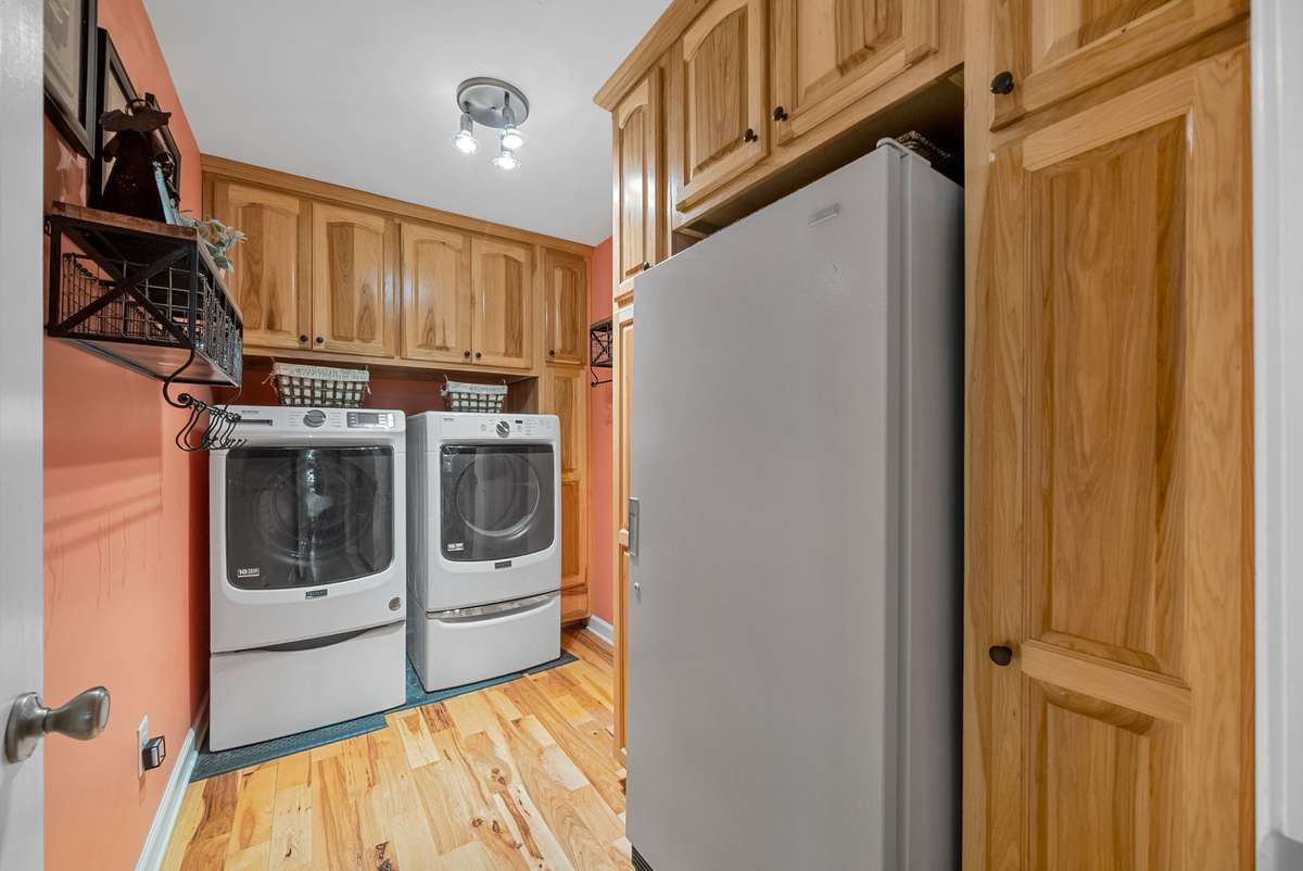 Separate laundry room with custom cabinets and freezer on the main level of home. Washer and dryer to remain with the home.