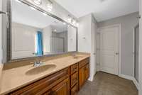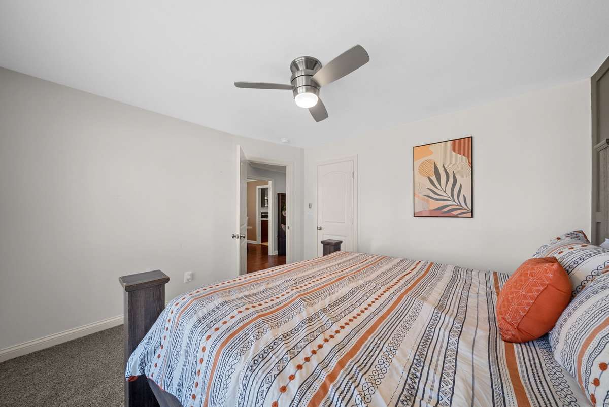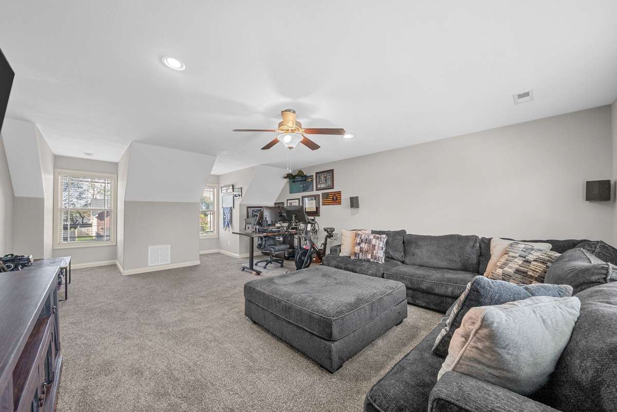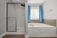 Downstairs offers a convenient bedroom and full bath — ideal for guests or a mother- in- law suite. Upstairs, the oversized bonus room with a closet can serve as a 5th bedroom, recreation space, or media room. The primary suite is a retreat in itself, featuring a jetted soaking tub and a custom closet.