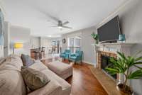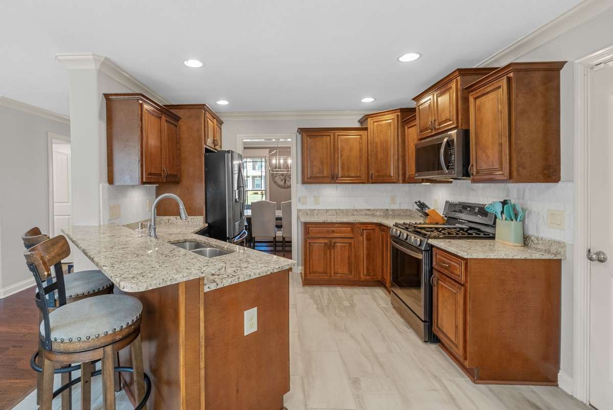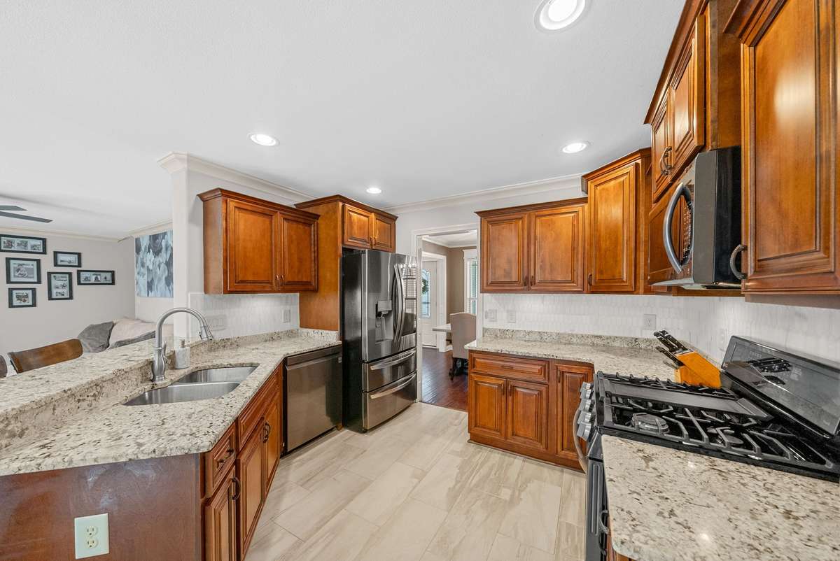The spacious kitchen is a true centerpiece — complete with granite countertops, a custom backsplash, gas cooktop, and a peninsula that opens to the living area. The formal dining room can easily double as a home office or flex space. The cozy living room boasts a natural gas fireplace, creating the perfect gathering spot for family and friends.