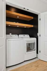 Upstairs, unwind in the serene primary suite with tray ceiling and peaceful views overlooking the private common area—perfect for restful nights. Two additional bedrooms offer flexibility for guests, office, or hobbies, and the laundry area features gorgeous wood beam shelving, accent lighting, and included washer & dryer.