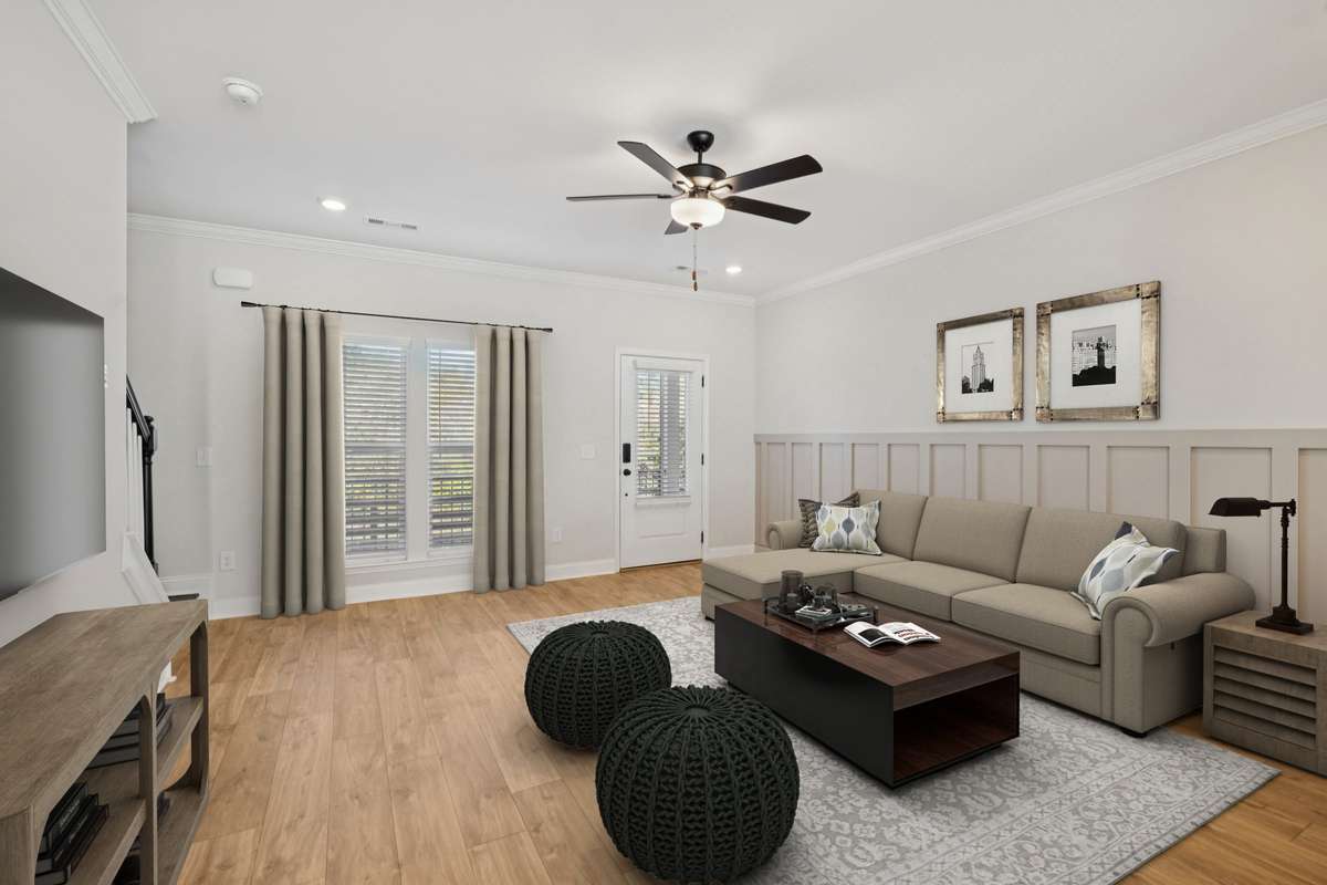 Step inside to discover wide- plank floors, 9’ ceilings, crown molding, and judges paneling that bring character and warmth to the space. Extra designer lighting in the living room and primary suite keeps things light and bright. The open living area flows right into a dreamy white kitchen with quartz counters, 12” subway tile backsplash, upgraded stainless appliances, and a farmhouse- style trough sink.