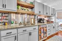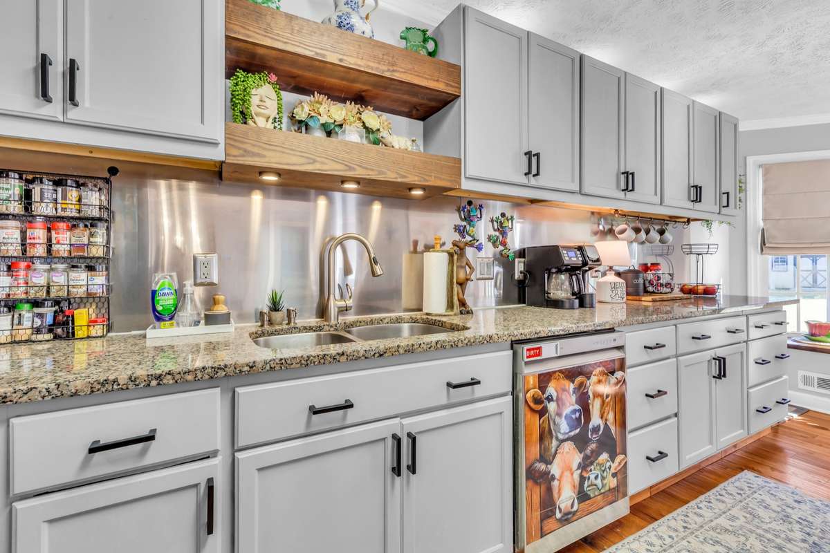 A well- designed kitchen features a large island with breakfast bar, shaker style cabinets, and warm wood shelving that adds natural character. An open dining area flows easily from the kitchen, creating a welcoming setting for meals or gatherings. A sliding barn door hides a spacious pantry, blending style and practicality. The primary ensuite serves as a peaceful retreat with dual sinks, soaking tub enclosed by a fully tiled shower and frameless glass partition, and a generous walk in closet. Secondary bedrooms offer comfortable space, while the additional full bathroom includes dual sinks and a tub and shower combination.