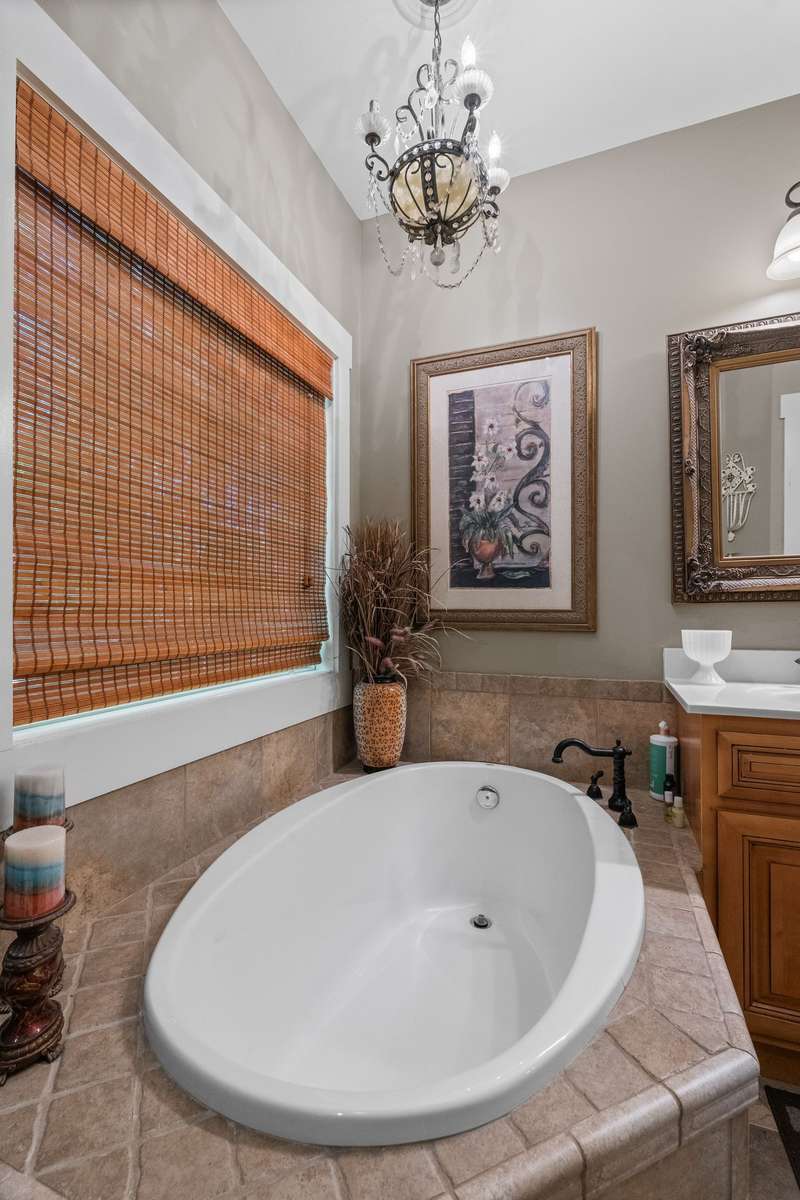 The primary suite, conveniently located on the main floor, offers an oversized soaking tub, a separate shower, and double vanities for a spa- like experience.