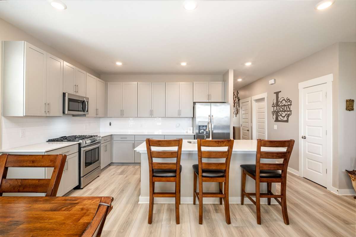 The chef’s kitchen offers quartz countertops, abundant cabinetry, and plenty of workspace — perfect for cooking, entertaining, or family gatherings.